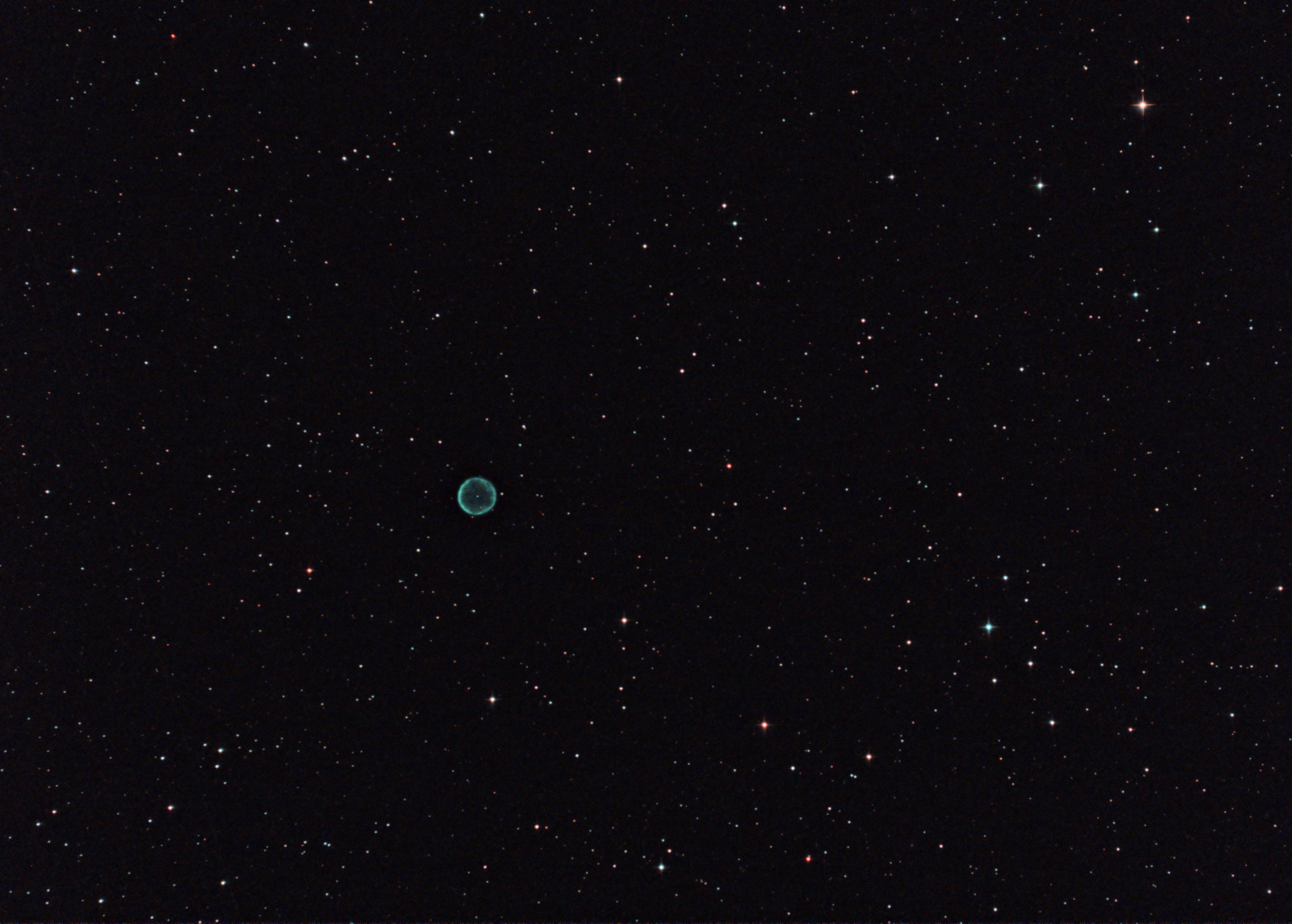 Abell 39 ist ein Planetarischer Nebel, der sich von unserem Sonnensystem etwa 6800 Lichtjahre entfernt befindet. Zusätzlich befindet er sich weit außerhalb der galaktischen Ebene, nämlich 4800 Lichtjahre weit draußen über ihr. Entdeckt wurde dieser perfekt runde Nebel 1969 von George Abell. Sein Durchmesser beträgt fünf Lichtjahre. Er strahlt bei 500,7 nm Wellenlänge (OIII). Die äußere Schale ist rund 0,3 Lichtjahre dick. Die Masse des Weißen Zwergs beträgt etwa 0,6 Sonnenmassen. In etwa die gleiche Masse hat der Nebel um ihn herum. Diese Aufnahme wurde mit Hilfe eines Dualbandfilters erstellt.