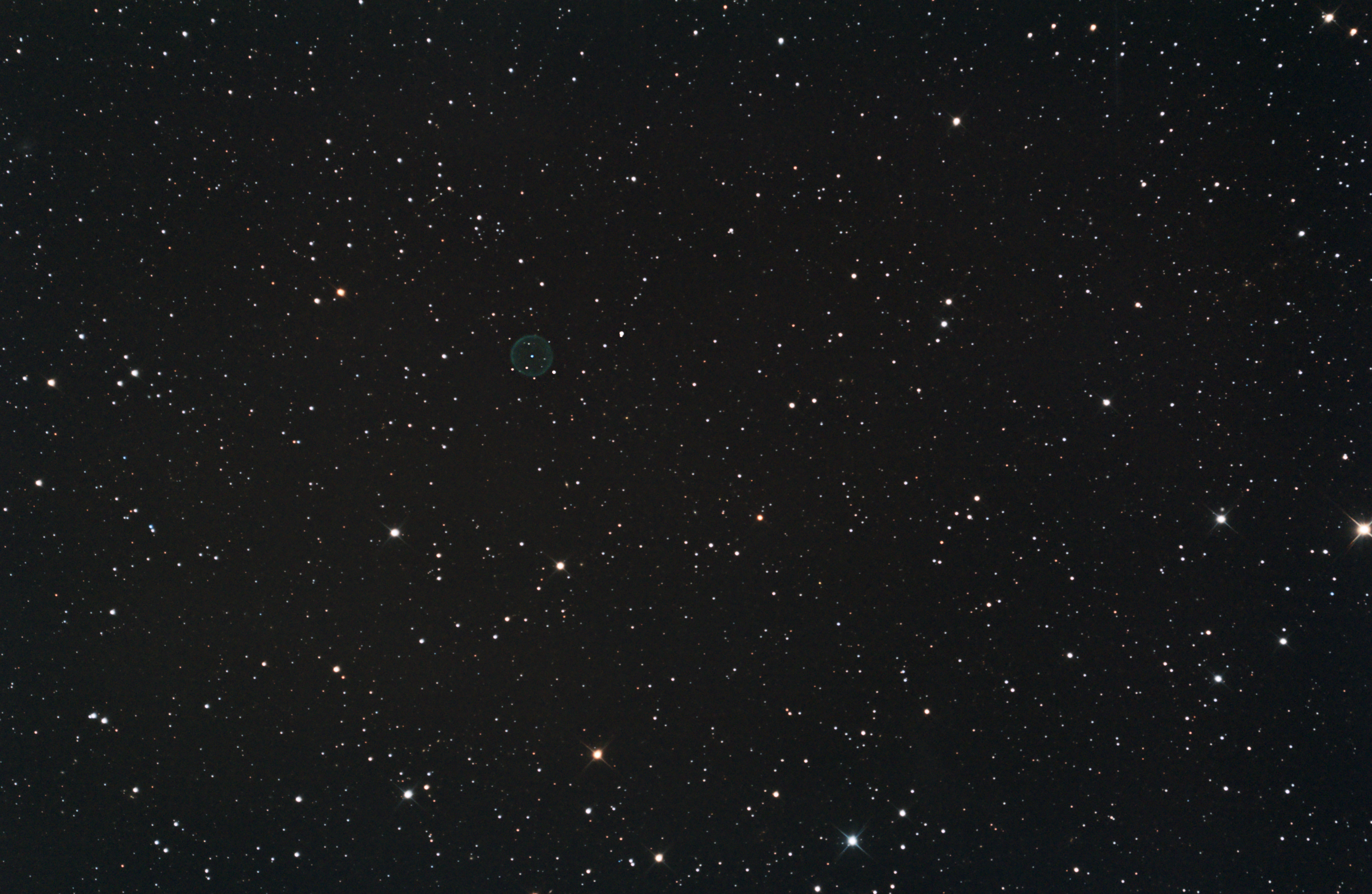 Ein Versuch mit dem 8" NoNa Photonewton und der CANON 60Da führten zu diesem Ergebnis. Abell 39 ist ein planetarischer Nebel, der sich von unserem Sonnensystem etwa 6800 Lichtjahre entfernt befindet. Zusätzlich befindet er sich weit außerhalb der galaktischen Ebene, nämlich 4800 Lichtjahre weit draußen über ihr. Entdeckt wurde dieser perfekt runde Nebel 1969 von George Abell. Sein Durchmesser beträgt fünf Lichtjahre. Er strahlt bei 500,7 nm Wellenlänge. Die äußere Schale ist rund 0,3 Lichtjahre dick. Die Maase des Weißen Zwergs beträgt etwa 0,6 Sonnenmassen. In etwa die gleiche Masse hat der Nebel um ihn herum.