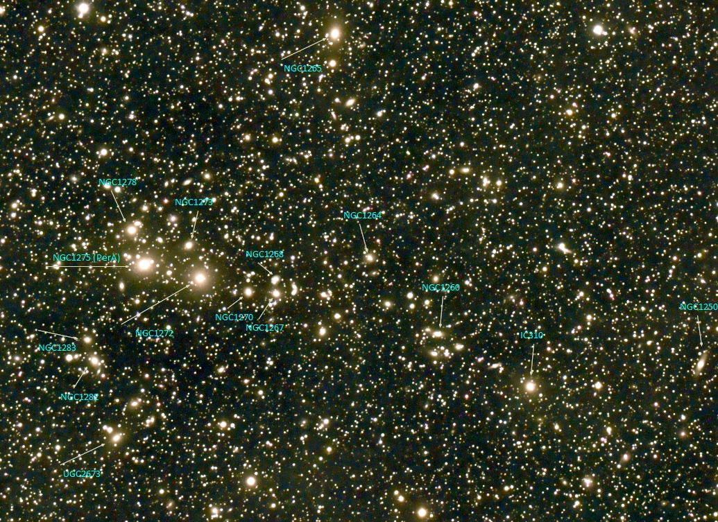 Der mitgliederreiche Galaxienhaufen Abell 426 im Sternbild Perseus gehört mit circa 420 Millionen Lichtjahren Entfernung zu den nahen seiner Art. Er besteht aus zahlreichen elliptischen und linsenförmigen Galaxien, deren hellste von ihnen die irreguläre Galaxie NGC 1275, eine der stärksten Radioquellen am Himmel ist (Per A) ist. Sie liegt nicht im Zentrum des Haufens, sondern am Rand einer fast linearen Kette von Galaxien. Deshalb wird der Haufen als »L« in der Rood-Sastry-Klassifikation geführt (Lineare Anordnung von Galaxien), im Gegensatz zum Coma-Haufen Abell 1656 mit der Bezeichnung Rood-Sastry cD (core dominant). Die Helligkeit der Mitglieder liegt zwischen 11,7 mag (NGC 1275) und etwa 16 mag. Diesmal interessierte mich aber, was ich mit meinem 100 mm/F4.1 Skywatcher Esprit, der eigentlich nichts anderes ist als ein Teleobjektiv von 10 cm Öffnung und 400 mm Brennweite ist, erreichen könnte. Das Bildfeld meiner ZWOASI533MC beträgt genau 1,5 x 1,5 Grad, so dass der gesamte Galaxienhaufen darin Platz findet. Prominent dabei sind nur NGC 1275 und NGC 1272. Deutlich sieht man die lineare Anordnung der helleren Galaxien. Abell 426 liegt zudem nur 13 Grad unter der galaktischen Ebene, wodurch er in einem reichen Sternfeld liegt. Zoomt man aber ins Bild hinein, so kommt eine große Anzahl von lichtschwachen Haufenmitgliedern zum Vorschein, bis zur 15. bis 16. Größenklasse. Das ist erstaunlich bei einem so kleinen Instrument! Es sind alle Galaxien und Sterne auf dieser Aufnahme zu sehen, wie sie auch mit meinem 8-Zoll-Newton sichtbar sind! Die Aufnahme beträgt dabei nur 3,5 Stunden und ich bin deshalb sicher, bei längerer Belichtungszeit alle Haufenmitglieder zu erreichen.