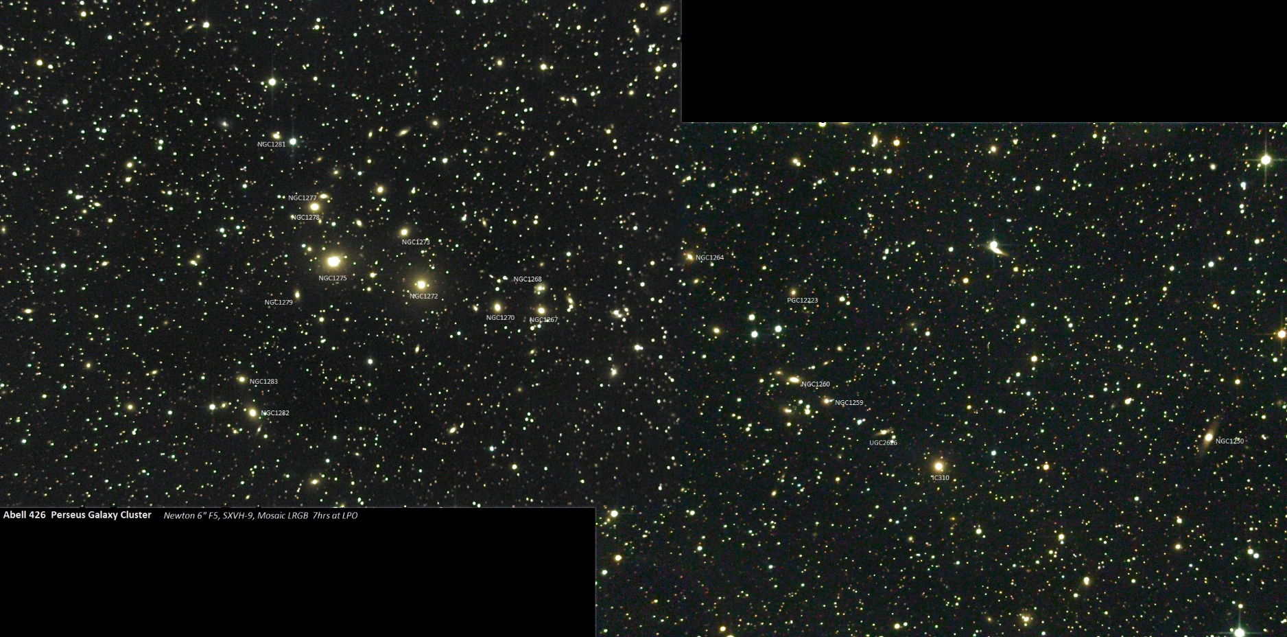 Abell 426 ist der berühmte Perseushaufen, zwei Grad nördlich von Algol gelegen. In einer Entfernung von 237 Millionen Lichtjahren ist er der hellste der Abell-Haufen und gehört zum Perseuse-Pisces-Superhaufen. Er zeigt eine gestreckte Form von 2 Grad Länge. Im Zentrum liegen 20 NGC-Galaxien. Die cD Galaxie NGC1275 ist 11,7 mag hell und bekannt als Radioquelle Pers A. Hier vereinigen sich gerade zwei Galaxien. Sogar mit dem 6-Zoll-Newton kann man die ausgestoßenen HII-Filamente erahnen. NGC 1272 und NGC1265 sind ebenfalls elliptische Riesengalaxien. Nur zwei der NGC-Galaxien sind Spiralen, der Rest sind E- und SO-Galaxien. Abell 426 ist daher ein stark entwickelter alter Haufen. Weil der Galaxienhaufen wegen der ausgedehnten zentralen Kette (Rood-Sastry-Typ L: Haufen mit linearer Anordnung) so ausgedehnt ist, habe ich ein Mosaik kreiert. Es erstreckt sich auf einer Länge bis 1,5 Grad.