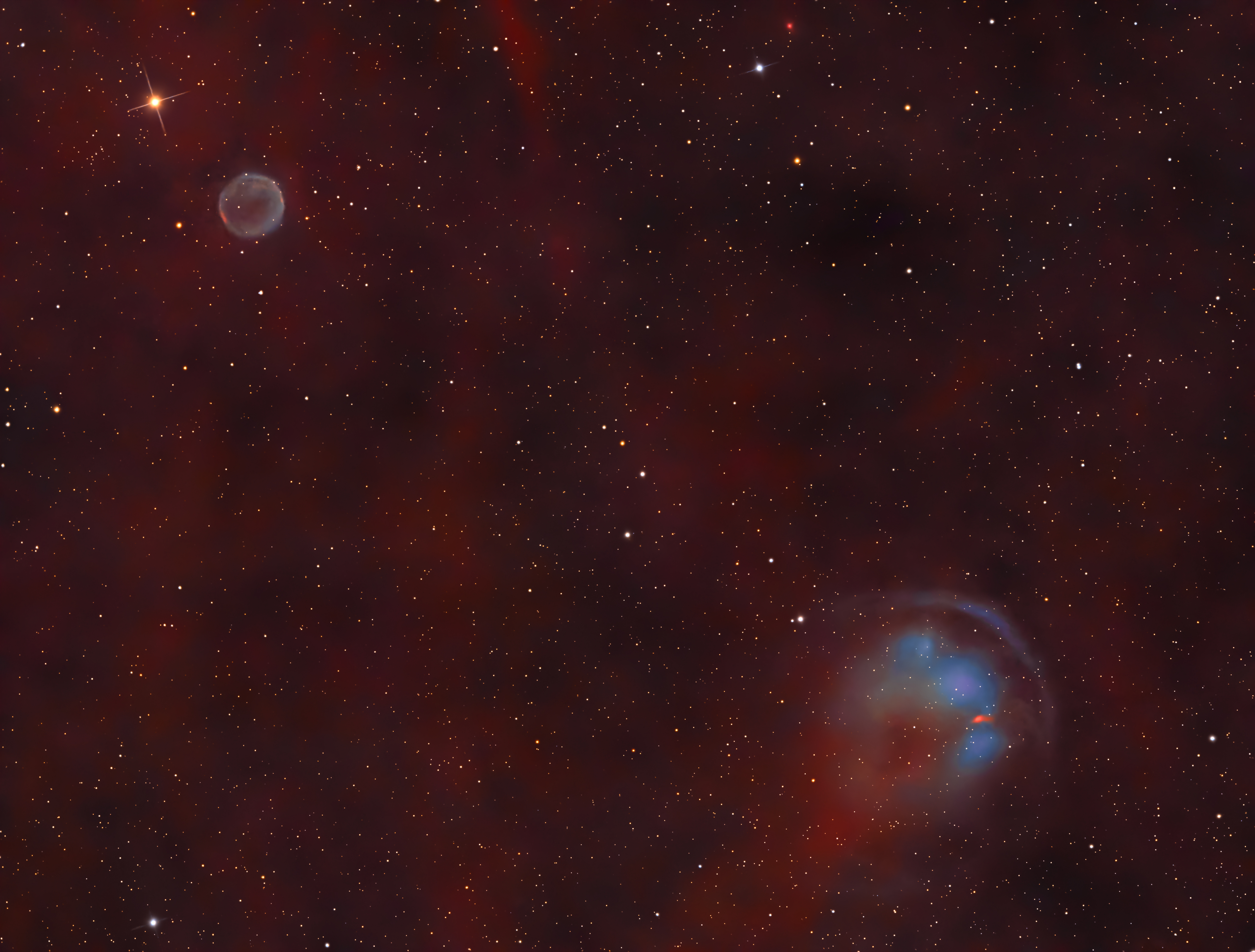 Die abgebildeten Motive befinden sich im Sternbild Kassiopeia, direkt über dem Herznebel, und sind mit den Akronymen Abell 6 (in der Mitte) und HFG1 (weiter rechts und unten) katalogisiert. HFG1 (Heckathorn-Fesen-Gull 1) und Abell 6 bilden ein interessantes Paar planetarischer Nebel (PN). Abell 6 hat das blasenartige Aussehen der meisten PNs und bleibt ziemlich schwach (Mag = 15). Es hat ein blaues Aussehen durch die Ionisierung von OIII und hat auch eine ziemlich starke H-alpha-Komponente. HFG1 (PK 136+05) wurde 1982 entdeckt und hat eine komplexere Struktur: Es stellt einen Kreisbogen gegenüber dem Schweif in Bewegungsrichtung des Nebels dar, was darauf hindeutet, dass es sich um eine Stoßwellenfront aus Materie handelt, mit der er interagiert das interstellare Medium. Der planetarische Nebel entsteht aus einem Doppelsternsystem, das aus einem Weißen Zwerg und einem großen Roten Riesenstern besteht. Die beiden Sterne sind sehr nah beieinander und drehen sich in nur 14 Stunden umeinander.