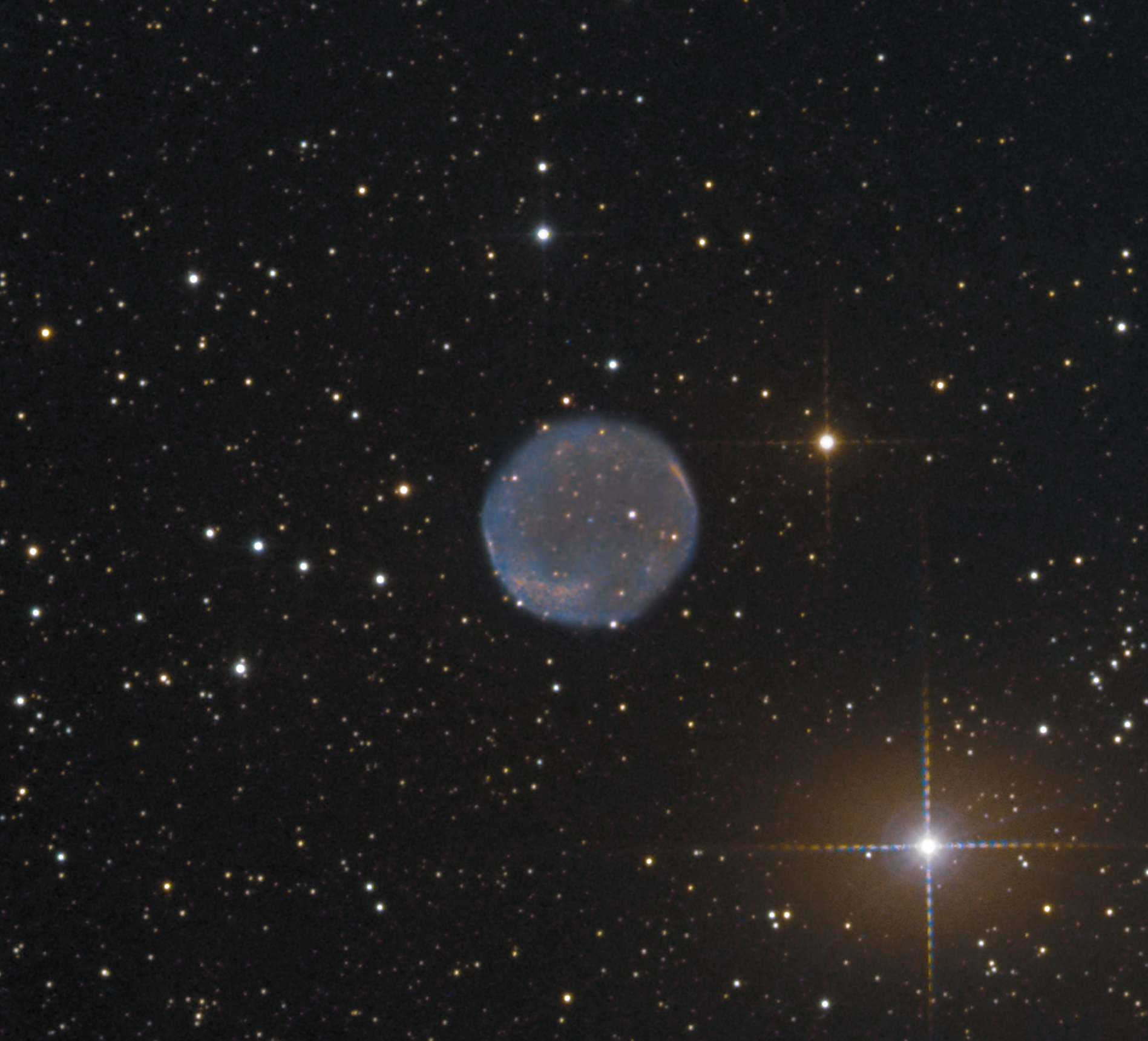 Abell 6 gehört ebenfalls zu den kleinen, selten abgelichteten Vertretern seiner Art. Er ist aber nicht die kleine strukturlose Kugel, sondern es gibt durchaus knotenartige H-Alpha-Elemente. Bei dieser Aufnahme sind insgesamt neun Stunden H-Alpha und drei Stunden OIII (2 x 2) verarbeitet. Es kam die STF8300 und die Atik460EXm zum Einsatz. Der Hintergrund leuchtet schwach in der H-Alpha-Linie.