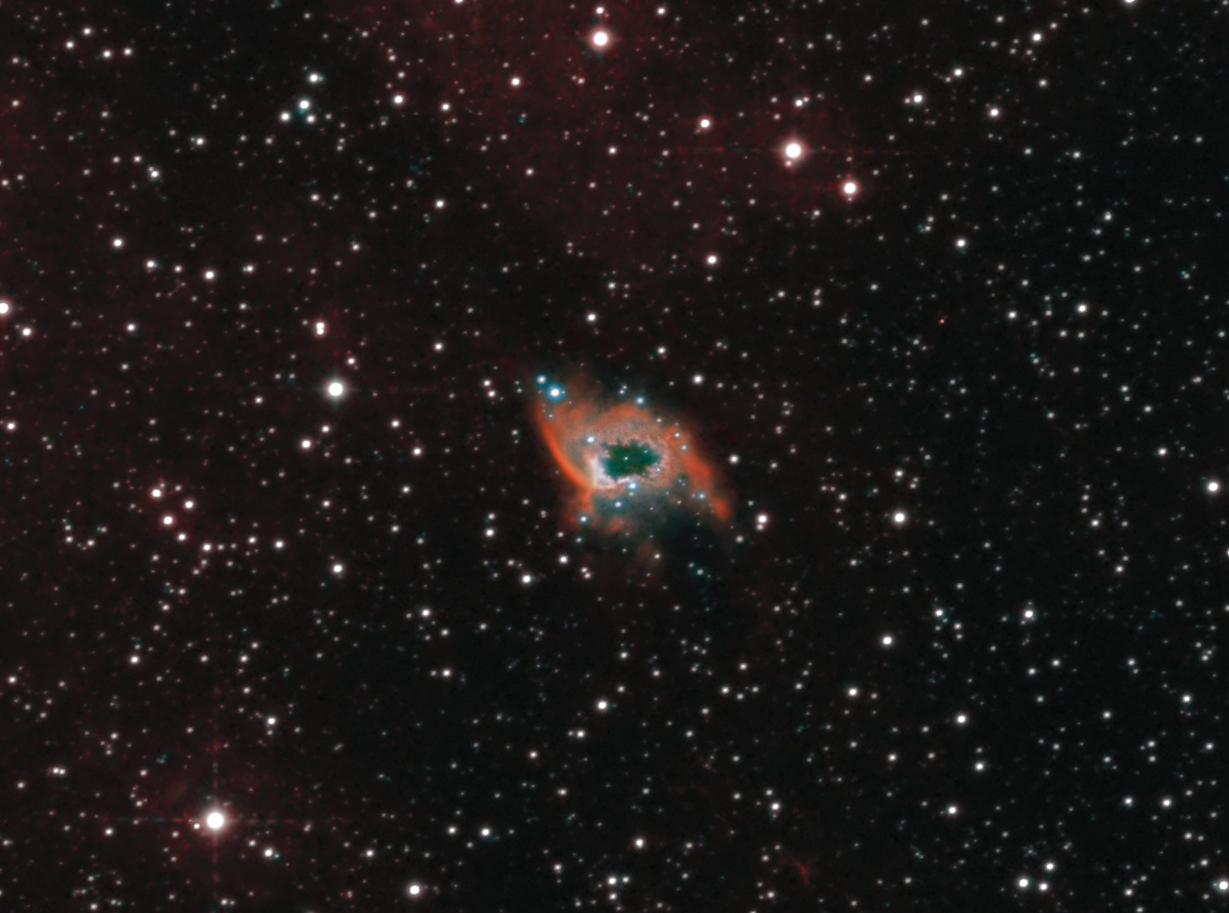 Es gibt so gut wie keine veröffentlichten Aufnahmen zu diesem Objekt, und wenn man es bearbeitet, weiss man auch wieso. Das rund 2,5 x 2,5 Bogenminuten kleine Objekt macht es einem wirklich nicht leicht. Dies hier ist das Ergebnis von rund sechs Stunden H-Alpha und sechs Stunden OIII. Ich habe deutlich mehr Daten gesammelt, jedoch war die Atmosphäre nur bei einem Teil der Daten ausreichend ruhig, um die zentralen Regionen darzustellen.