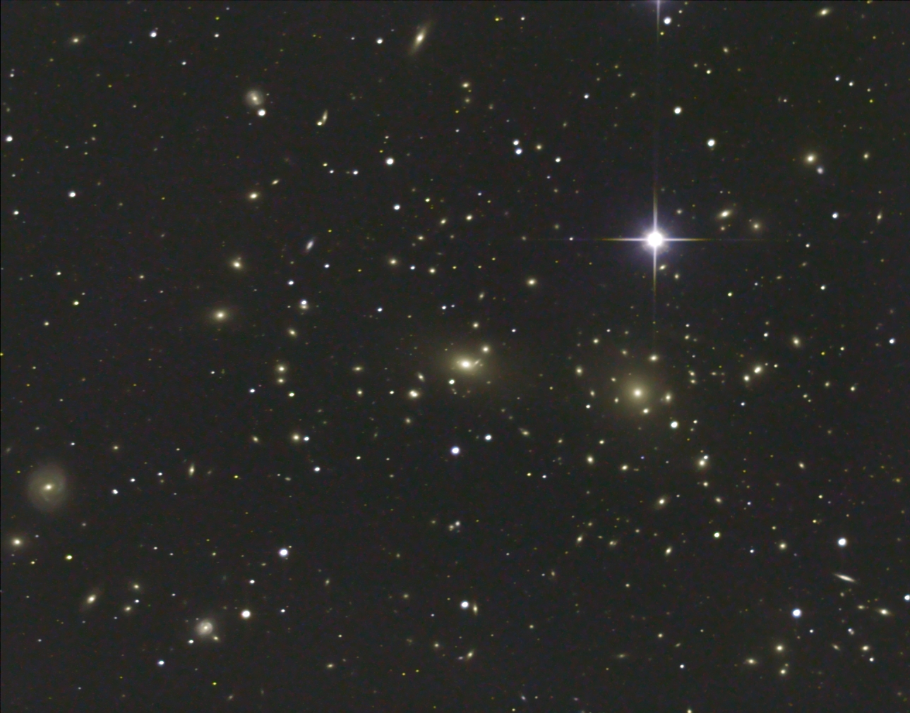 Nur der zentrale Teil des Coma Galaxienhaufens passte hier auf den CCD-Chip. Der Coma Haufen gehört mit der Rood-Sastry Klassifikation B zu den galaxienreichen,symmetrischen und zentral verdichteten Systemen, Er beinhaltet neben den Riesengalaxien(CD) NGC 4874,4889,4839 viele elliptische Zwerggalaxien und etliche (15%) S-Systeme wie NGC 4921,4907,4896.