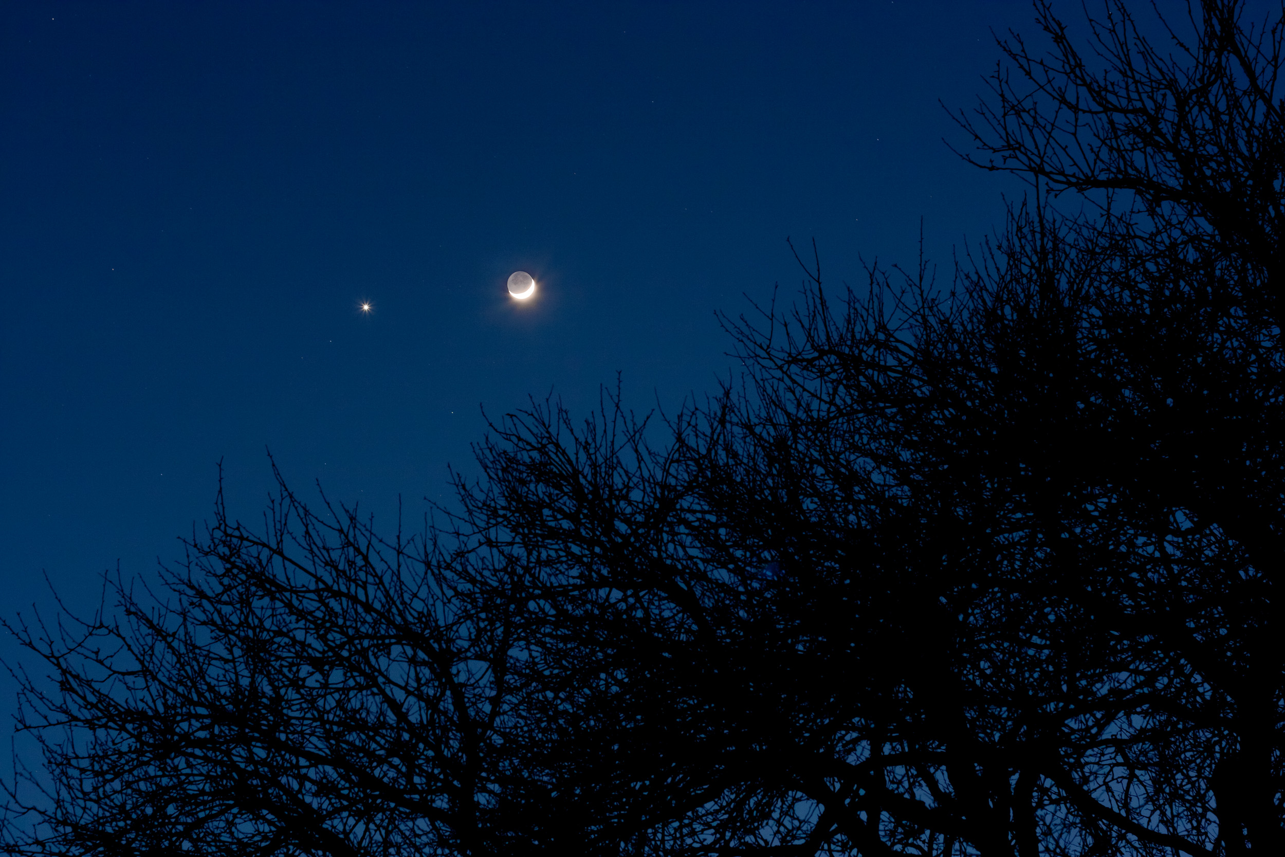 Nachdem die Vorabende zur Beobachtung der jungen Neulicht-Mondsichel wetterbedingt leider nicht taugten, klappte es endlich am 25.2.2012: Die nahe Begegnung der zu 13 % beleuchteten Mondsichel in knapp 3° Distanz zu Venus. Die Begegnung der hellsten Paradeobjekte am Dämmerungshimmel ist ein Klassiker, an dem man sich nie satt sehen kann.