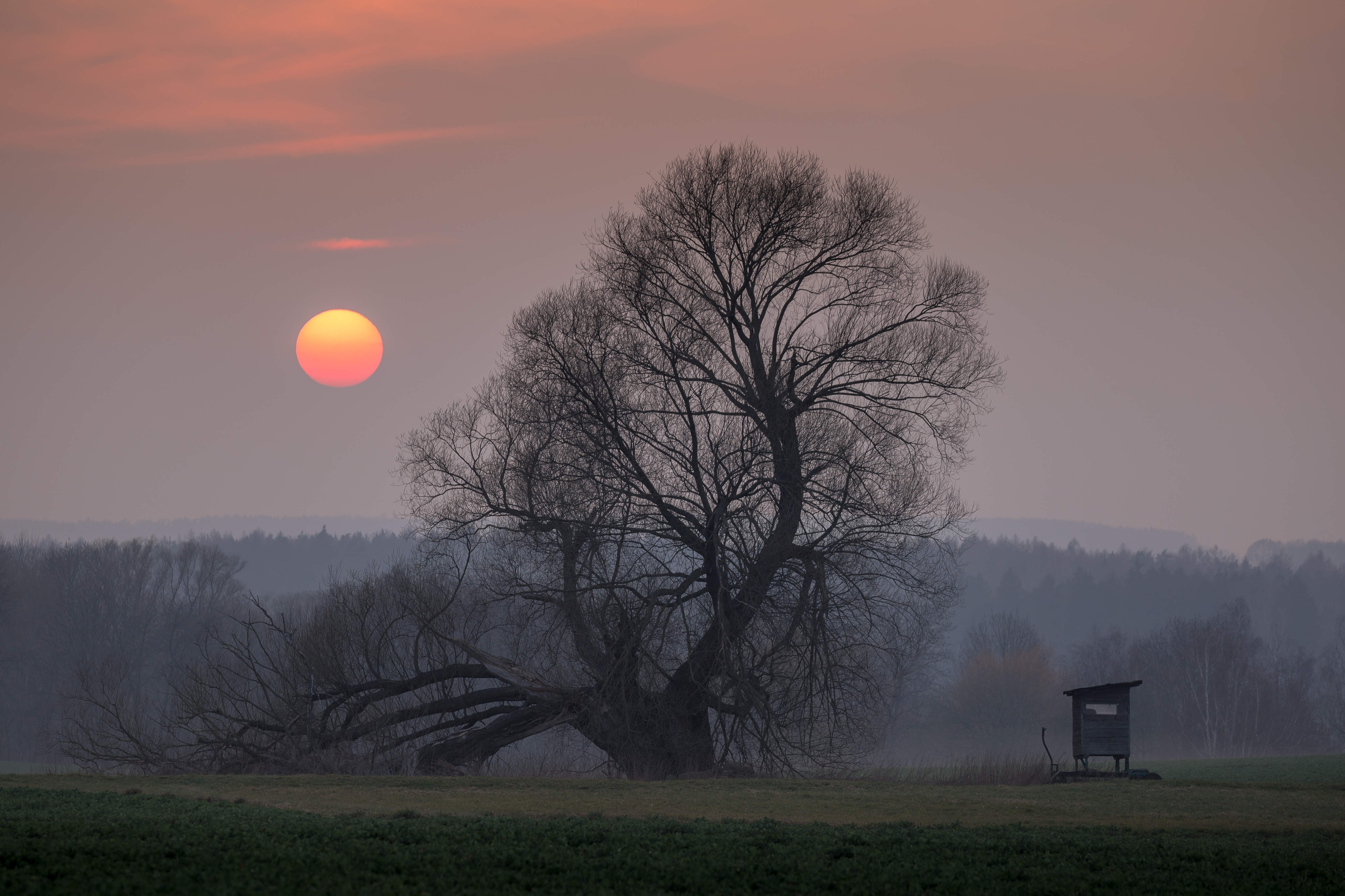 Gestern Abend konnte ich eine wunderschöne Sonnenuntergangsstimmung einfangen. Die Sonne wurde durch Hochnebel und den Saharastaub so derartig abgedunkelt, das man sie problemlos ohne Überbelichtung der Sonnenscheibe fotografieren konnte. Die riesige alte Weide mit dem abgebrochenen Ast erschien mir als Vordergrundmotiv ziemlich passend. Durch meine längere Krankheit, hatte ich die Kamera noch nicht auf Winterzeit umgestellt. Deswegen stimmt die Zeitangabe nicht mit der in den Metadaten überein.