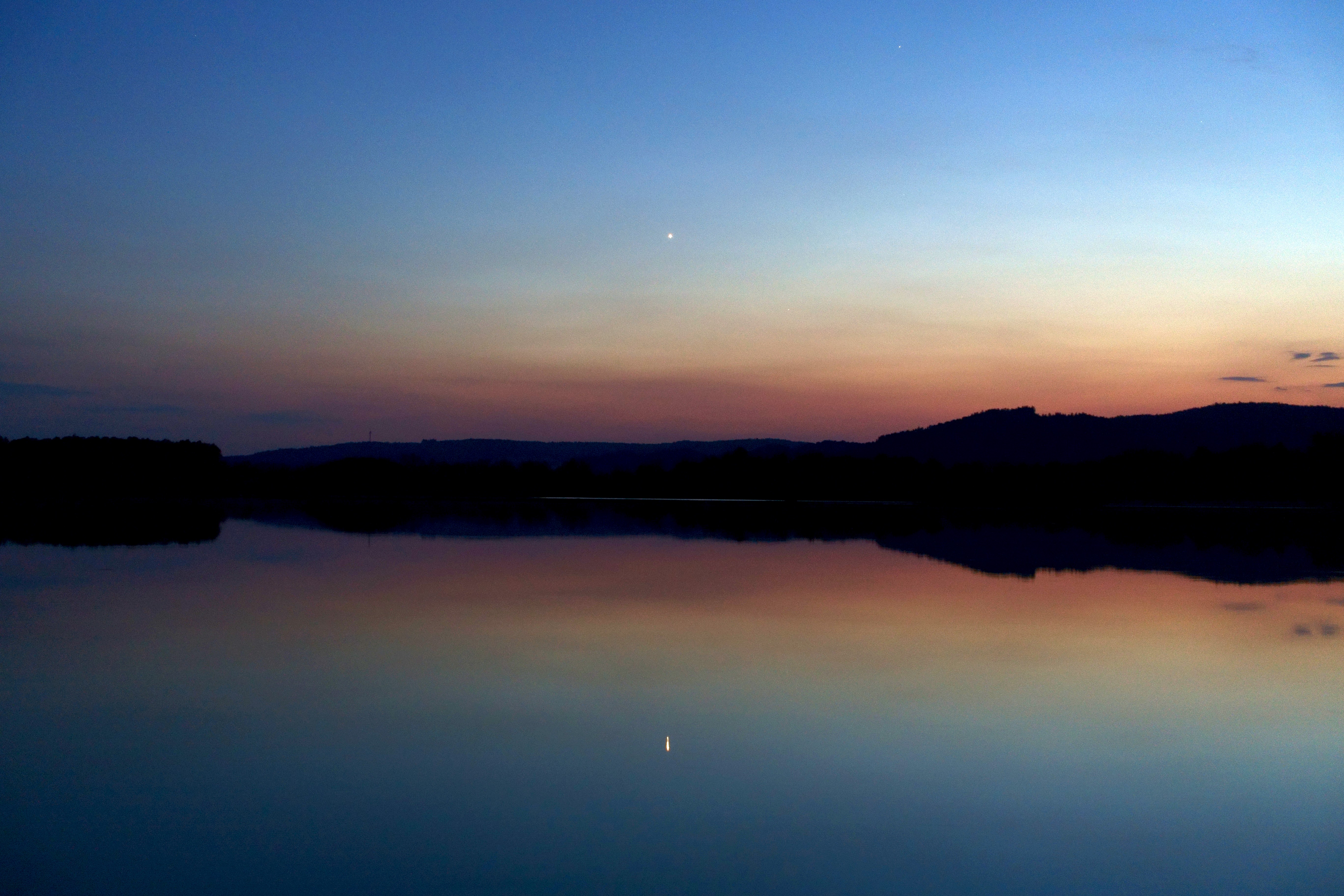 Venus strahlt am Abendhimmel und selbst ihr Spiegelbild im Inn-Stausee bei Frauenstein/Oberösterreich ist noch auffallend. Schwach ist auch noch Regulus rechts unterhalb der Venus erkennbar.