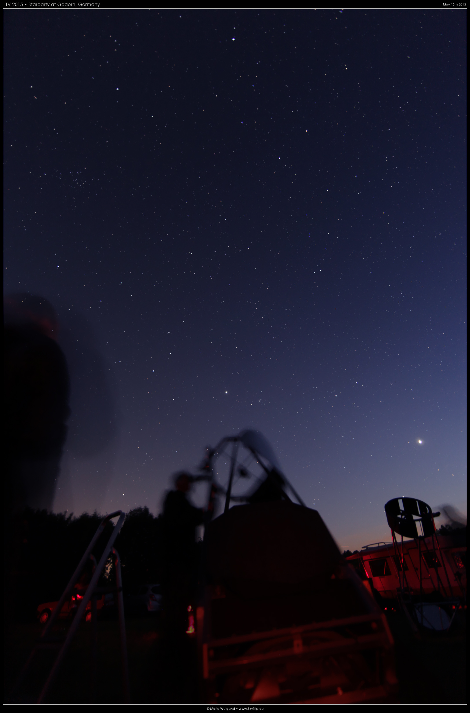 In der Abenddämmerung waren die meisten Teleskope auf die beiden hellen Planeten Venus und Jupiter gerichtet. Nach der astronomischen Dämmerung konnte man in den verschiedensten Geräten Kugelsternhaufen und Galaxien bewundern.