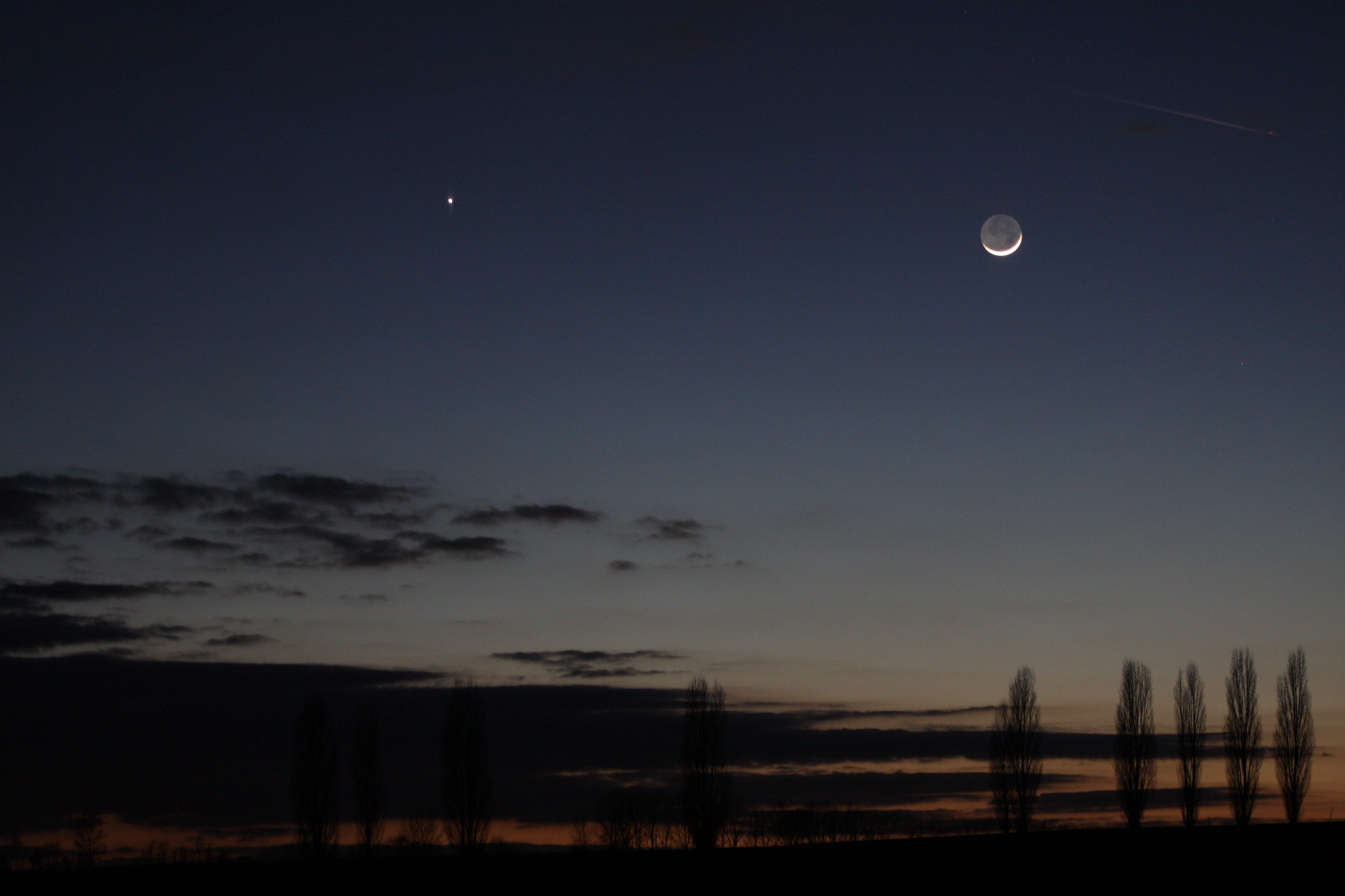 Es ist wunderschön, am Abend bei solch herrlichem Wetter die junge Mondsichel und Jupiter über'm Horizont betrachten zu können. Auch die "restlichen Lichter" schalten sich am Himmel so nach und nach ein.