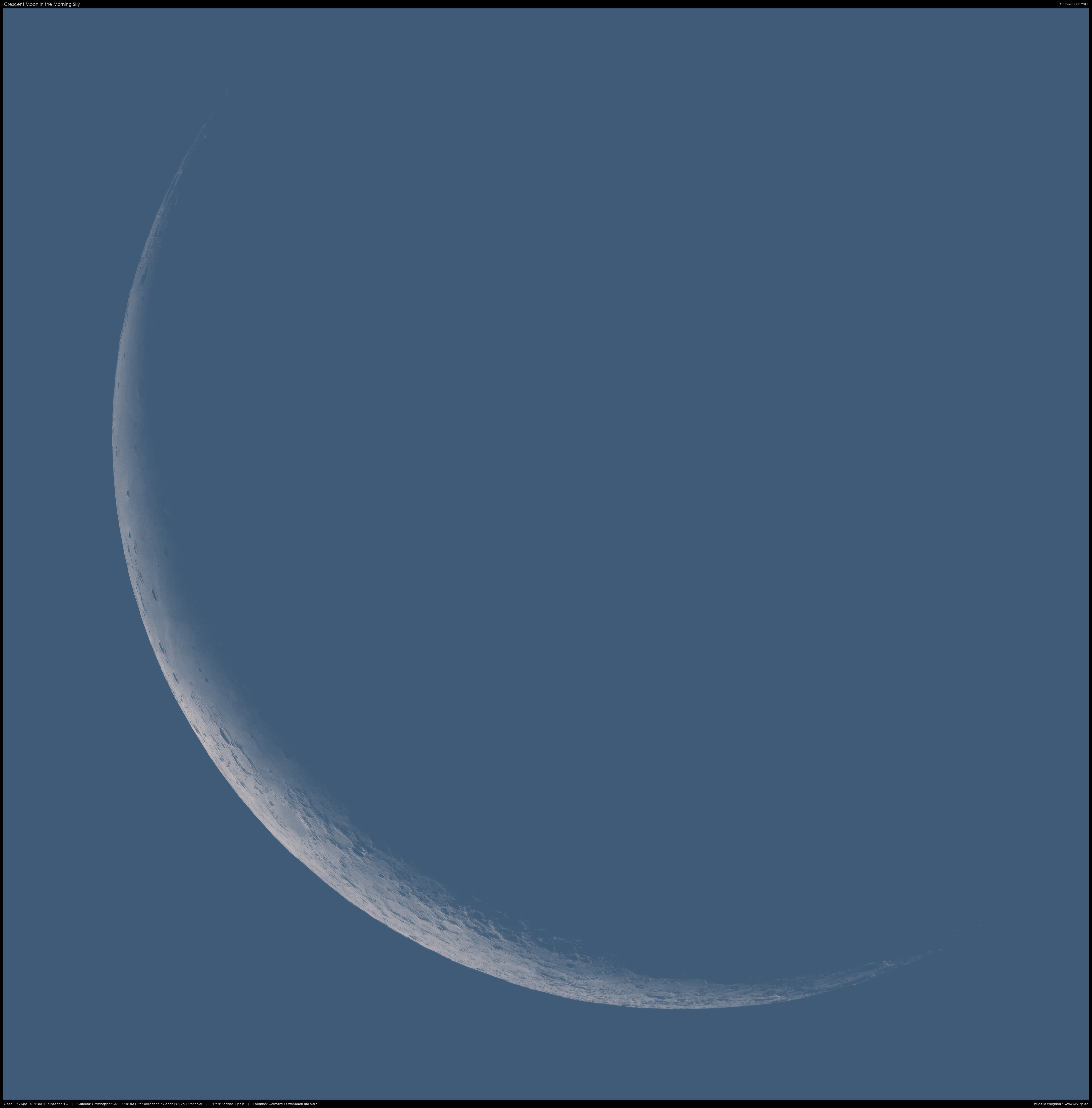 Die Mondsichel am Morgenhimmel mit nur 6,6 Prozent Beleuchtungsgrad, was einer Lunation von 27,1 Tagen entspricht. Das Mosaik besteht aus 9 Einzelbildern, die ich mit der Grasshopper 3 am TEC 160ED Apo unter Verwendung eines IR-Passfilters gewonnen habe. Für jedes dieser Bilder wurde ein Video mit 2000 Frames in AutoStakkert! 3 verarbeitet. Die Verwendungsrate betrug 40 Prozent. Die Farbdaten habe ich mit der Canon EOS 750D aufgenommen und in Photoshop mit dem Mosaik kombiniert. Zur Schärfung kamen die Deconvolution und der iterative Gauß-Filter in Fitswork zum Einsatz.