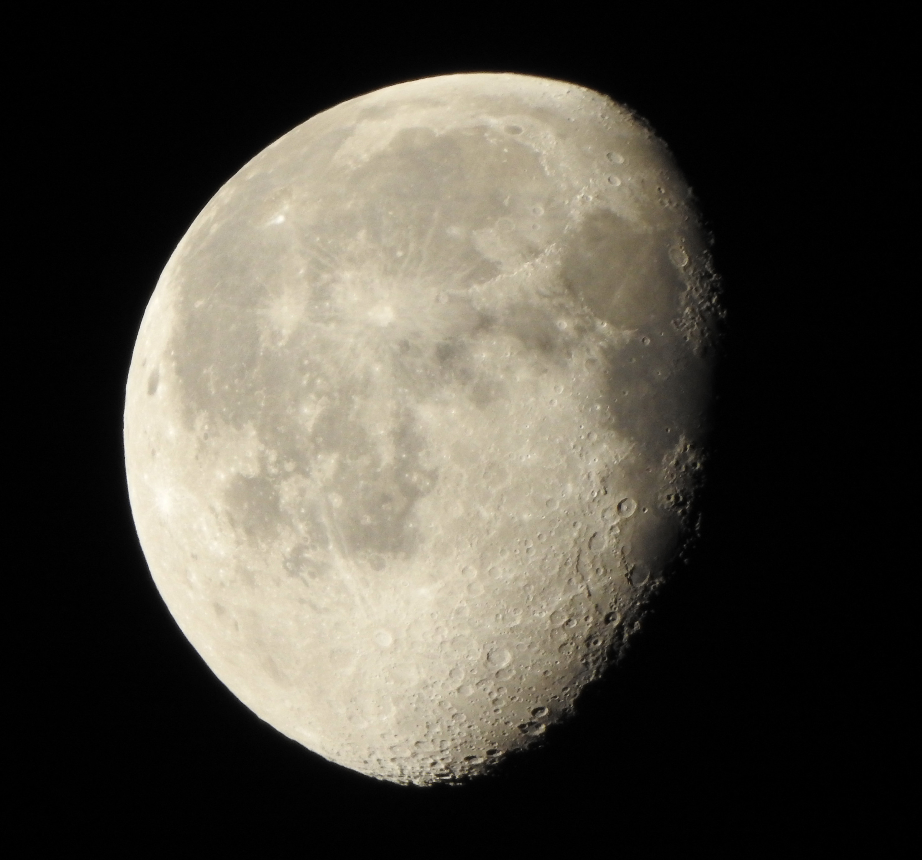 Endlich wieder einmal nebelfrei stand der Mond nach Mitternacht hoch am Himmel. Aufnahmen mit der Bridgekamera zeigten dabei einiges Detail. Ohne viel Vorbereitungen. Einfach drauflos. Zoom in maximaler Telestellung (f = 375 mm, f 6,3) Auto und Selbstauslöser.