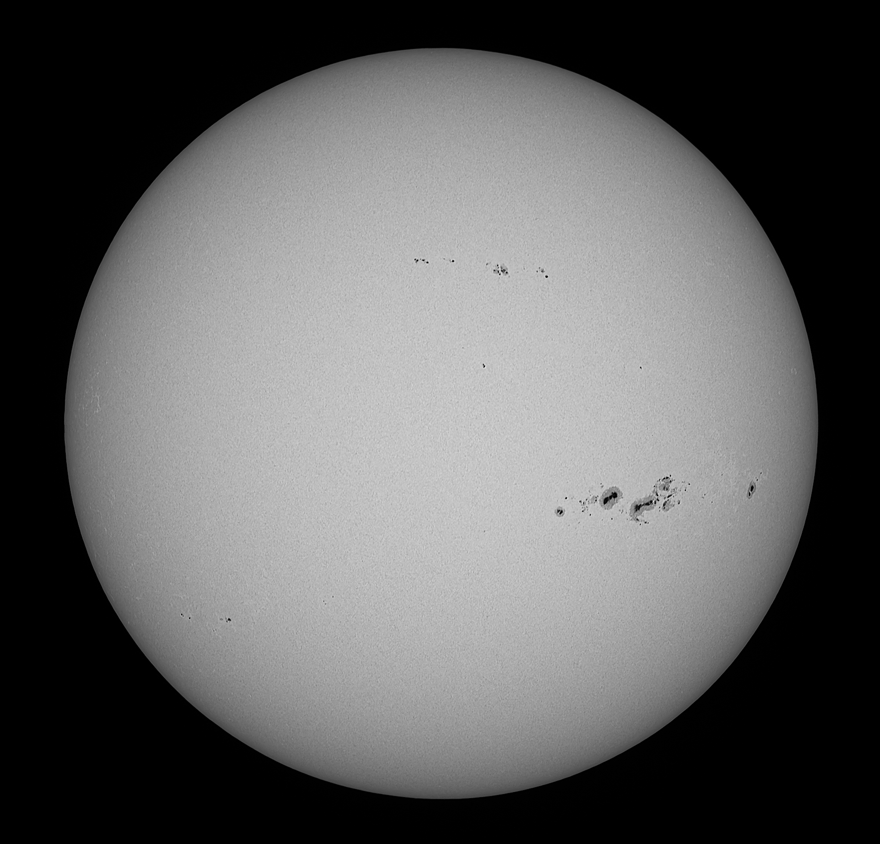 Eine Woche zuvor, am 1. Dezember 2025, ragte das Sonnenfleckenungetüm, bestehend aus den Gruppen 14294, 14296 und 14298 in die Osthemisphäre hinein. Hier war mir auf die Schnelle nur ein kurzer Blick mit kleinem H-alpha-Fernrohr und einem 6 x 30 Sonnenbino in der Mittagspause gegönnt. Der Blick machte aber schon Freude auf mehr. Dies zog sich aufgrund der Wetterunbilden hin. Heute, eine Woche später, hatte ich noch einmal das Glück mit einem 125-mm-Teleskop fotografisch beobachten zu können. Schnell ziehende Kumuluswolken und Zirrenschleier erzeugten auf Ihre Weise für Spannung. Doch zumindest fokal mit 800 mm Brennweite hat es geklappt! Höhere Vergrößerungen waren nicht sinnvoll einsetzbar. Trotzdem: Ein schöner Abschluß, bevor die Gruppen den Westrand umrunden! Baader Astro Solar Fotofolie OD 3,8.