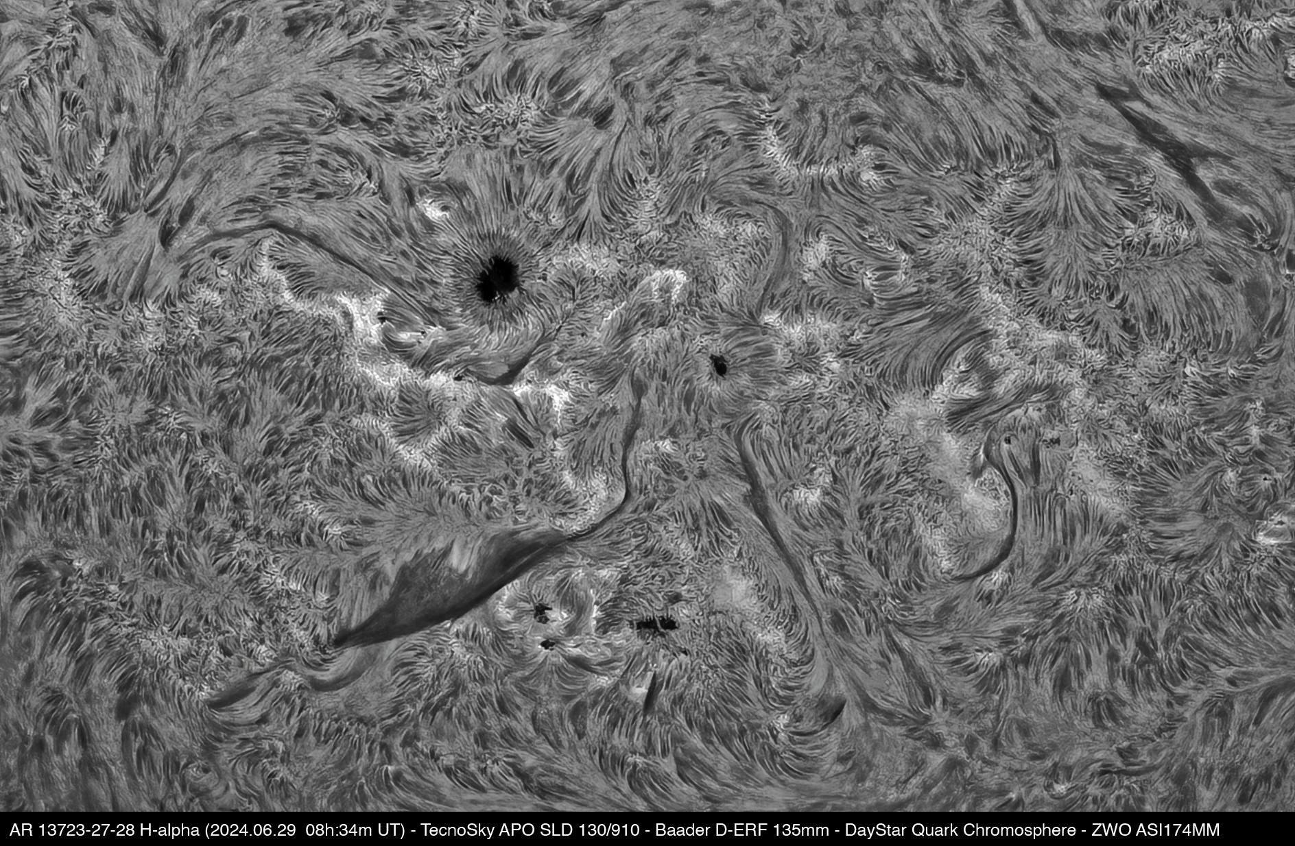Active regions 13723-27-28 imaged in the H-alpha line on 29 June 2024
