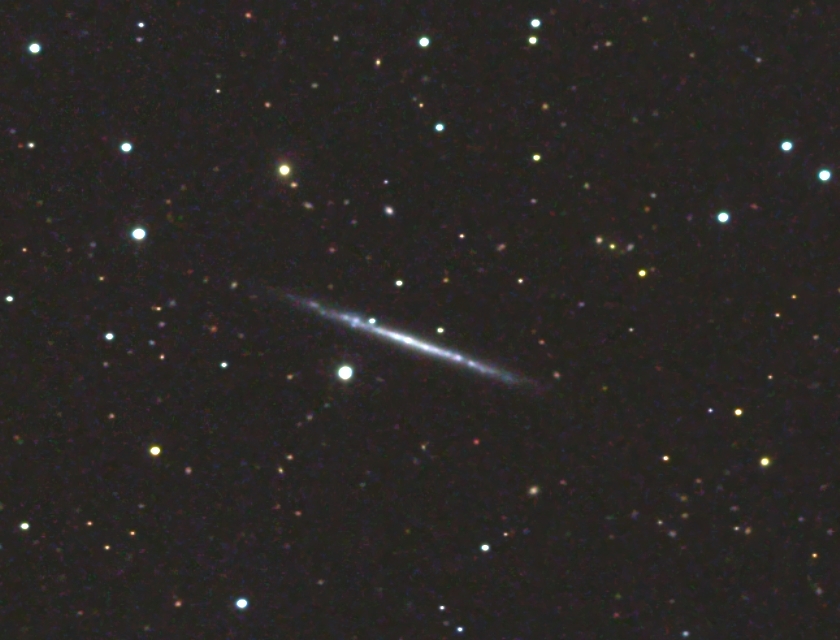 In dieser Vergrößerung sieht man das charakterstische Zeichen einer ST-Galaxie: den fehlenden Bulge der Spiralen,und die multiplen Sternverdichtungen in der Ebene.Das Zentrum ist unauffällig. Auch fehlen Staub in der Ebene wie z. B. bei NGC 891 oder NGC 4565. Das Verhältnis Länge zu Dicke beträgt hier 16.6:1 !