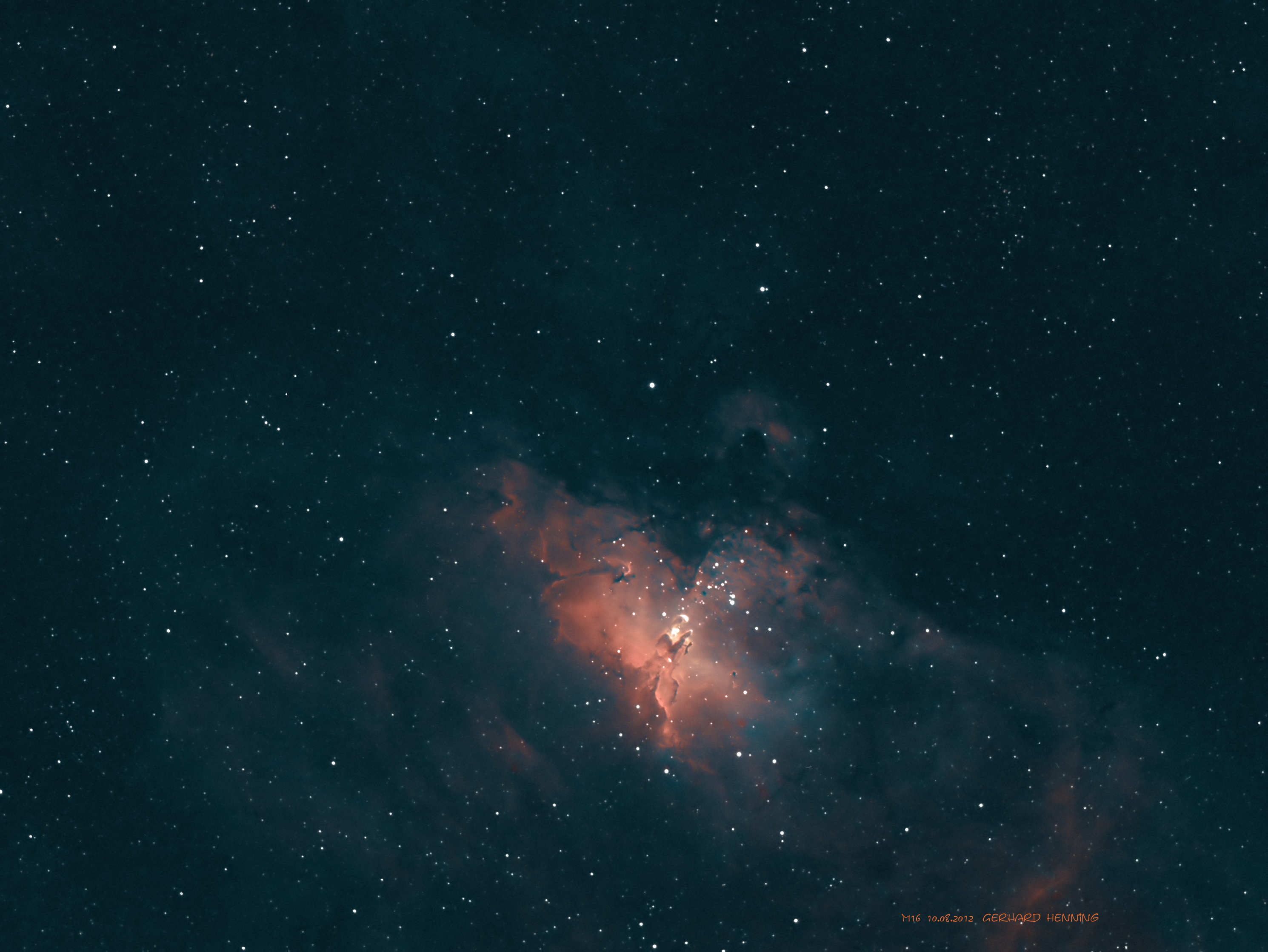 Auf dem Bild ist zu erkennen, warum der Adlernebel seinen Namen trägt. Mit H-alpha-OIII-Bicolortechnik ist das Bild entstanden. Es zeigt die H-alpha- und OIII-Emissionen sehr deutlich.