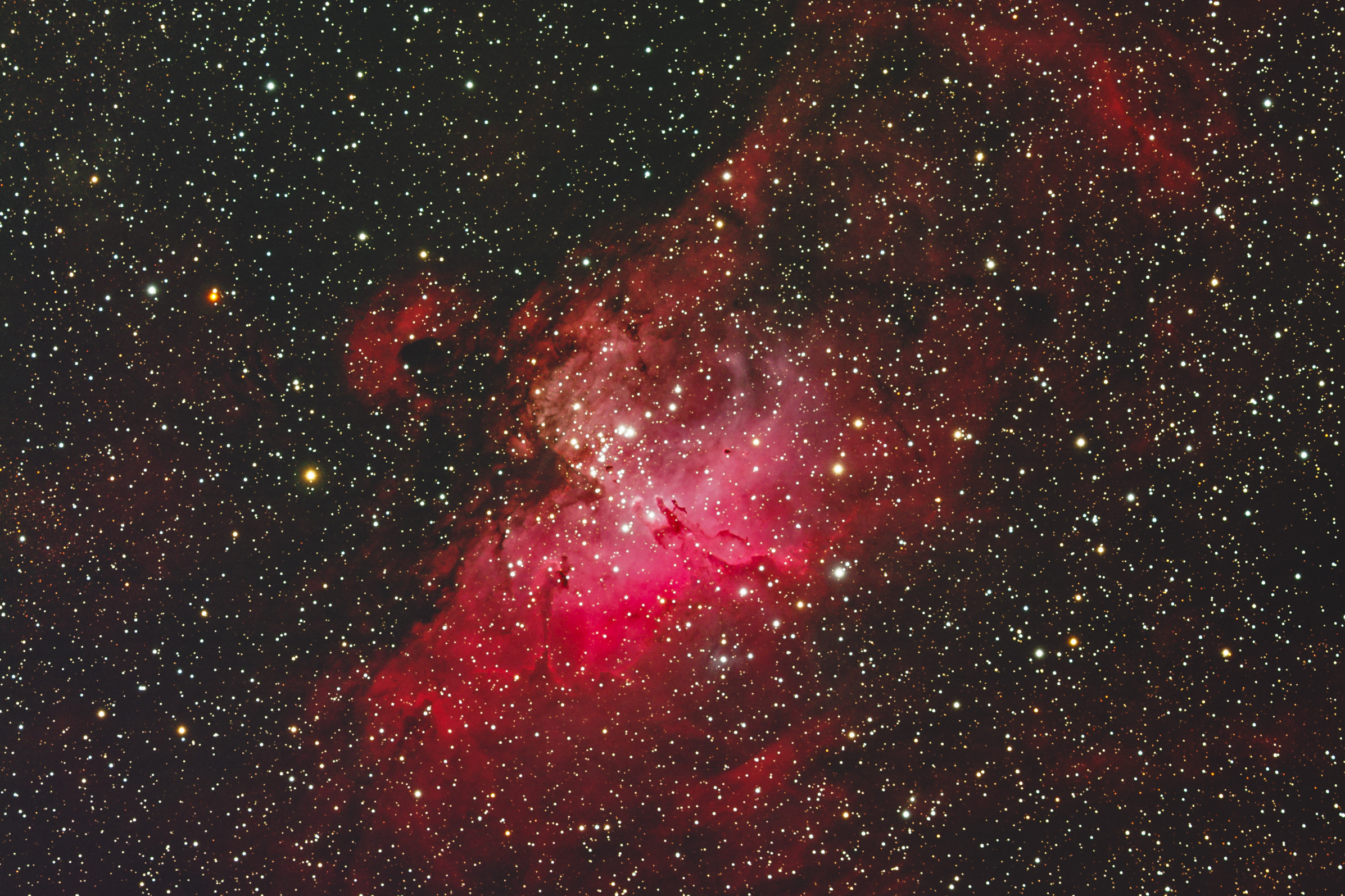 Dies ist eine Aufnahme des Adlernebels im Sternbild Schwanz der Schlange (lateinisch: Serpens Cauda) mit den bekannten "Pillars of Creation", aufgenommen anlässlich der Swiss Star Party 2012 auf dem Gurnigelpass.