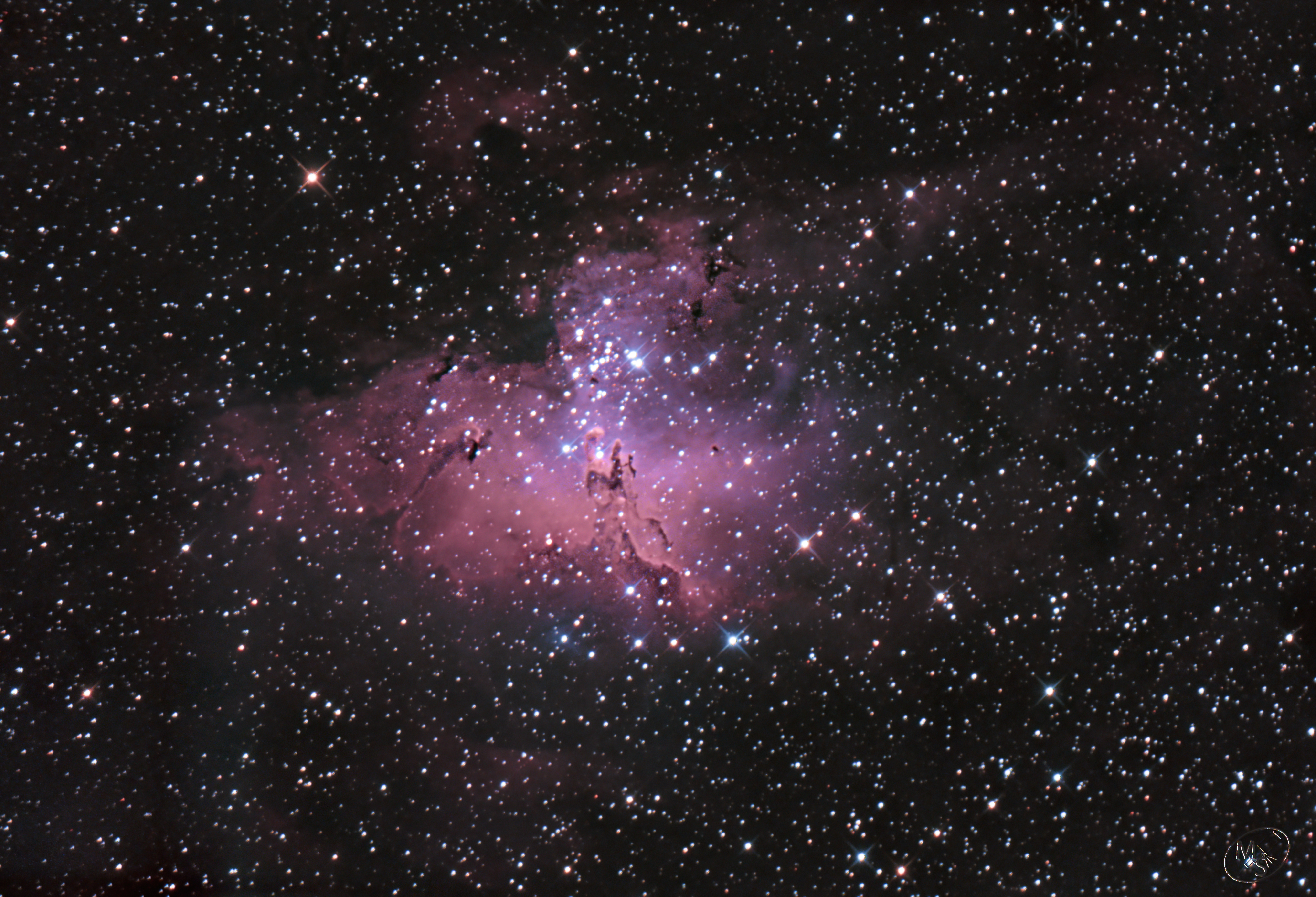 Der Emissionsnebel und der offene Sternhaufen bilden einen schönen Hintergrund für die "Säulen der Schöpfung".