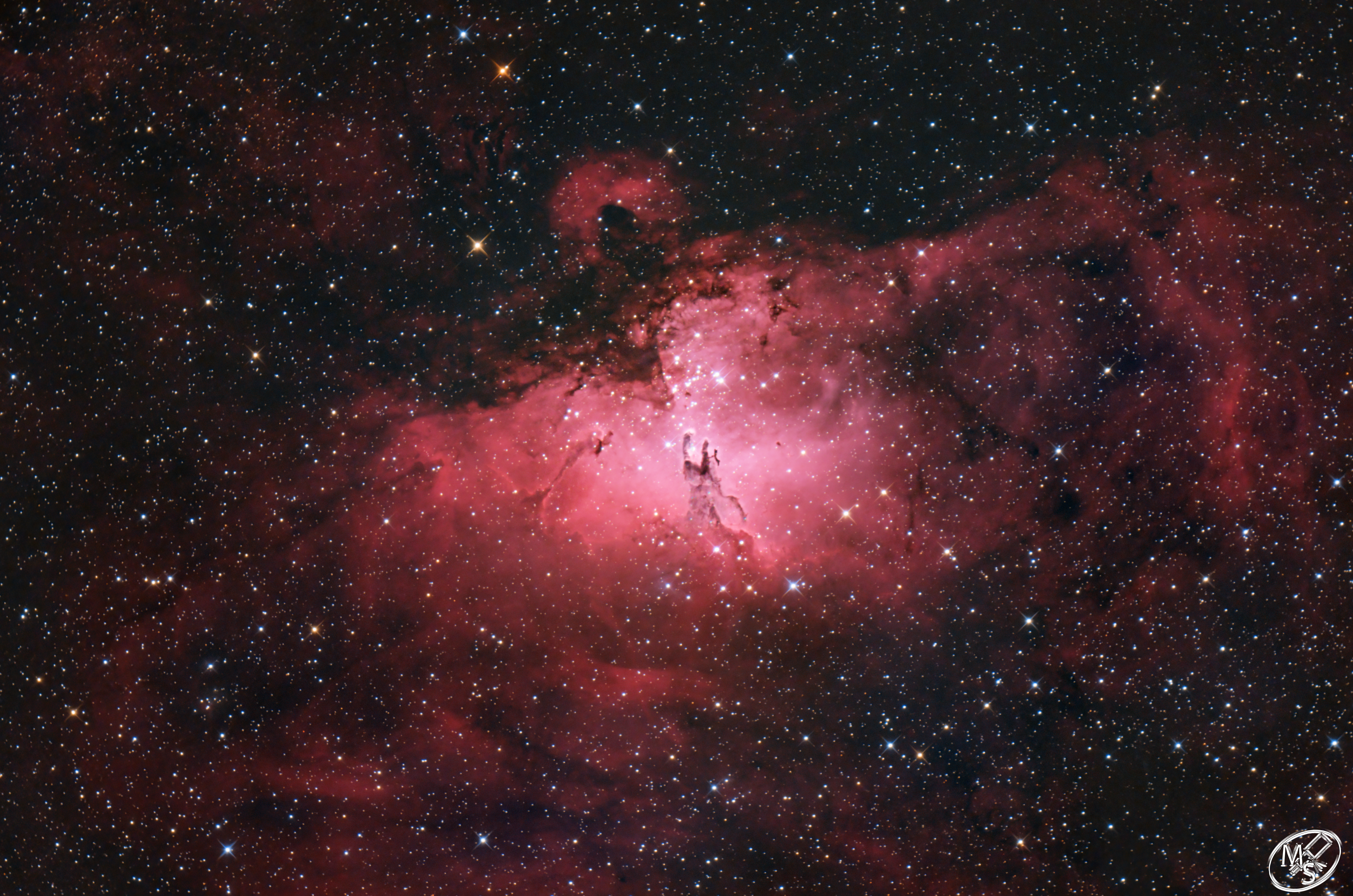 Ende Mai 2023 gab es trotz kurzer Nächte die Möglichkeit, den Adlernebel aus Berlin heraus zu fotografieren. In drei Nächten ist bei wolkenlosem Himmel dieses Foto bei herausgekommen. Im Vordergrund sind auch ganz gut die Säulen der Schöpfung zu erkennen.