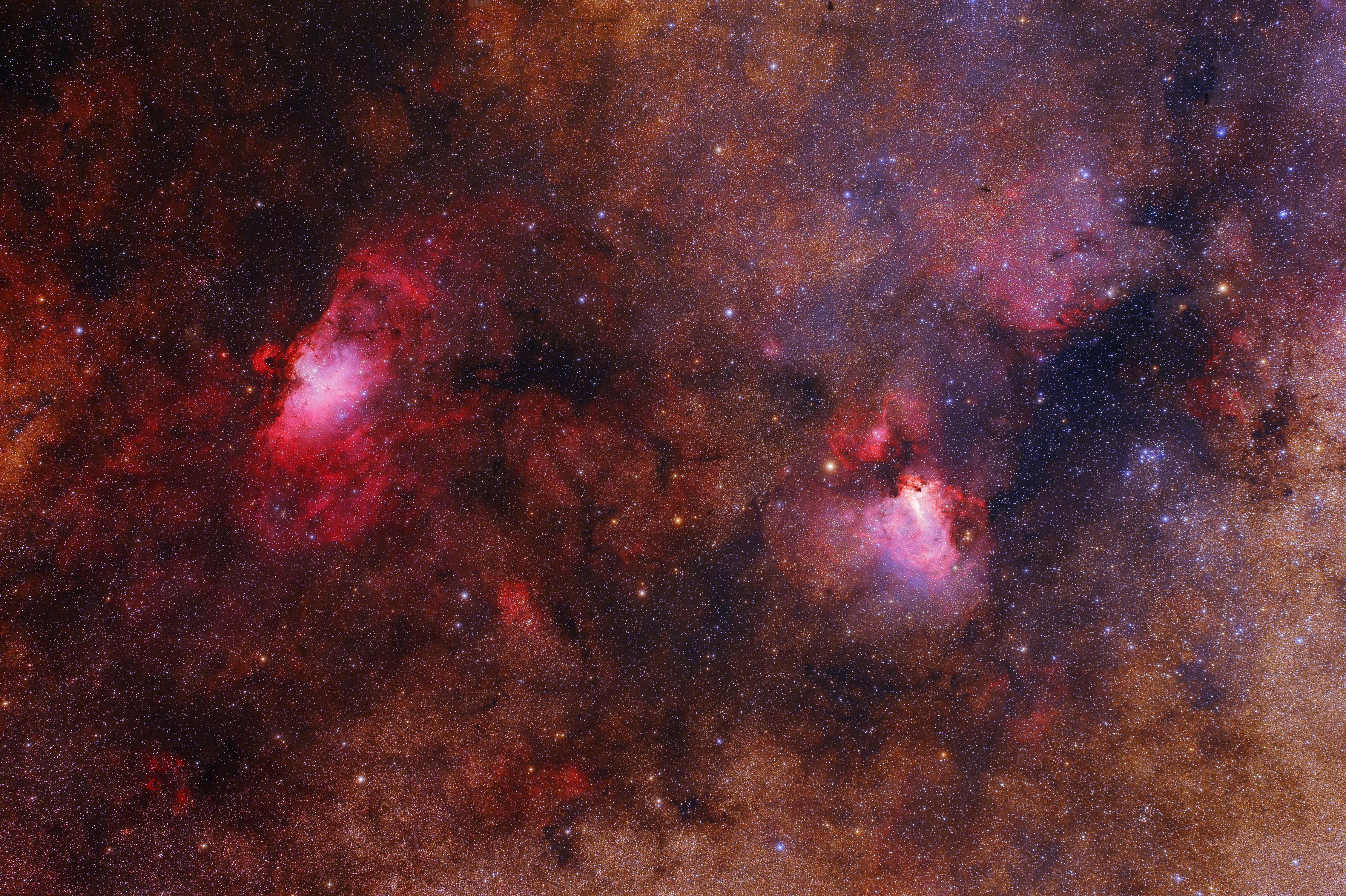 Zu den Paradeobjekten der südlichen Sommermilchstraße gehören in unseren Breiten der Adlernebel M16 und der Omeganebel M17. Südlich davon schließt sich der kleine offene Sternhaufen M18 an. Die Aufnahme entstand in zwei Nächten am Ende des namibischen Winters auf Farm Tivoli. Norden ist links.