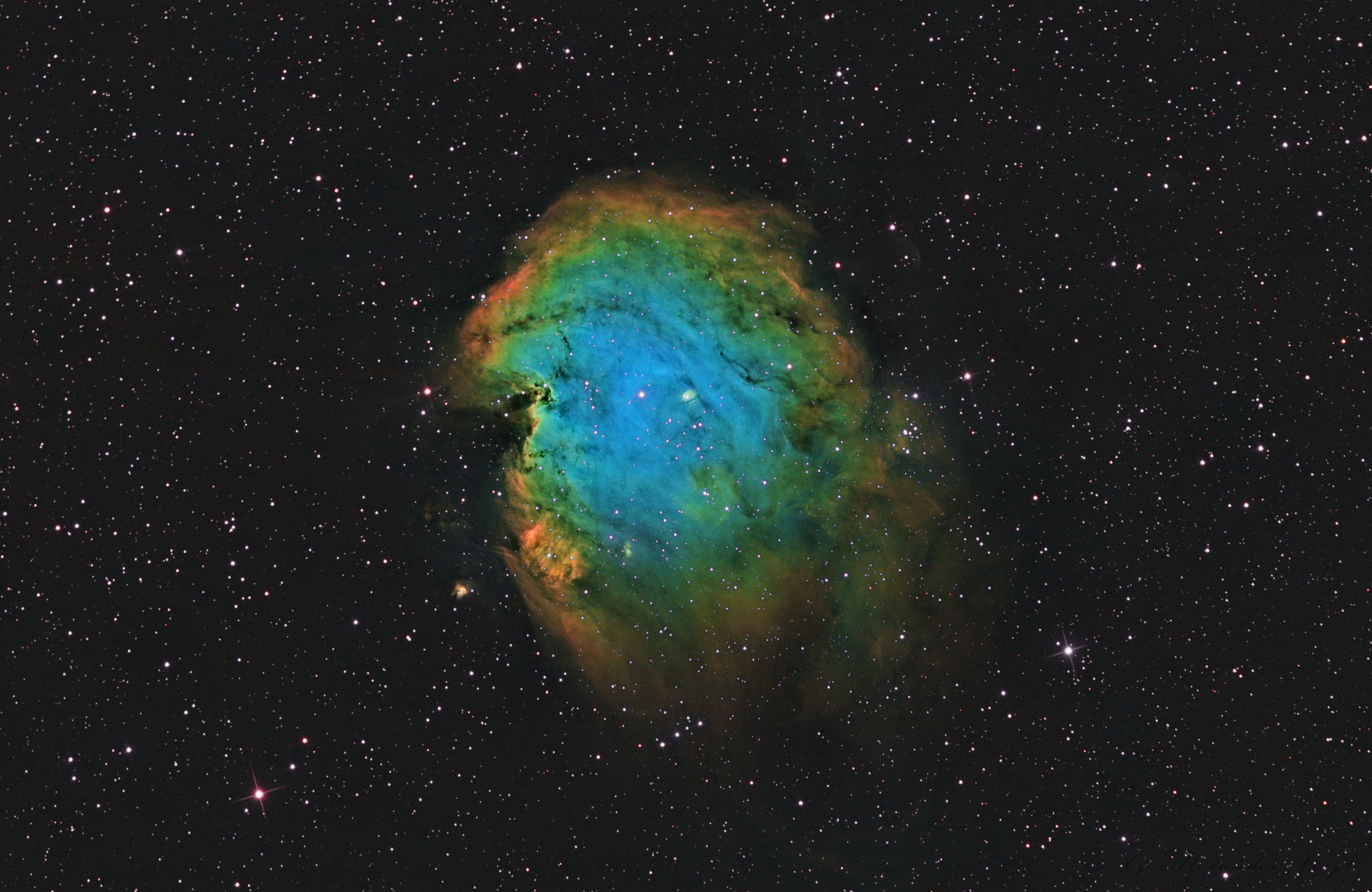 Am Anfang der Woche, hab ich meinen 6-Zoll, F4-Newton mit dem ASA-Reducer mal wieder auf die Montierung gepackt. Zum einen um den Arbeitsabstand vom Korrektor zu finden und zum anderen um zu schauen, ob die 3-nm-Astrodon-Filter auch mit den F2,8 zurechtkommen. Ziel war NGC2174, der Affenkopfnebel. Über drei Nächte hab ich insgesamt etwas über 16 Stunden zusammen bekommen.