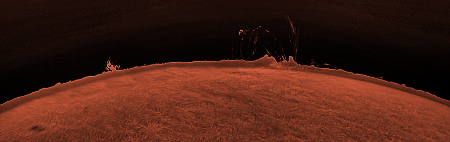 Am Westrand der Sonne ist eine aktive Region aufgetaucht, die aus zwei (?) Flecken und einigen Protuberanzenspritzern besteht. Ich habe versucht, Protuberanzen, Spikulen, Flecken und Magnetlinien in vier Bildern (4 AVIs) aufzuzeichnen. Dann habe ich die vier Filme mit der Batch- und der Joinmethode verarbeitet. Unser erstes Bild zeigt das Resultat der Batchmethode, deren vier Bilder zu einem HDR-Bild verarbeitet wurden. Besonders gut kommen die Flecken heraus.