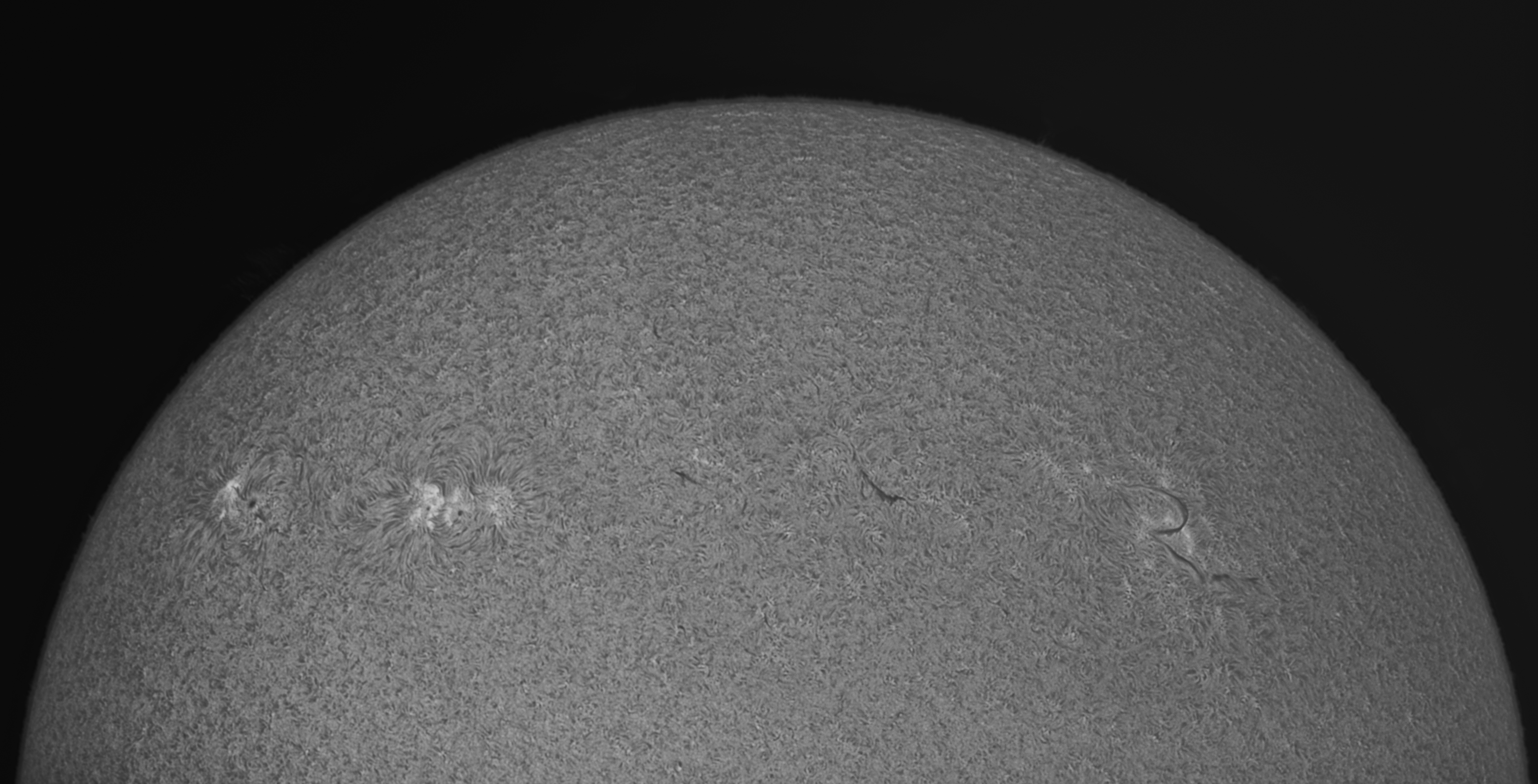 Aktive Zonen auf der Sonnennordseite in H-Alpha. Die hellen Zonen links entsprechen den aktiven Regionen 2812 und rechts davon 2811. Das Foto entstand aus den etwa 700 besten von insgesamt 10000 Bildern.