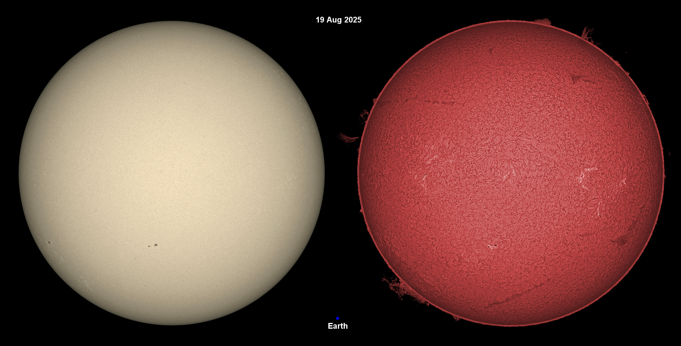 Die Sonne, simultan aufgenommen im Weißlicht (links) und in H-alpha. Nur wenige Sonnenflecken sind im Weißlicht zu erkennen. In H-alpha dagegen sind gewaltige Protuberanzen am Sonnenrand und lange Filamente auf der Sonnenscheibe zu erkennen. Die Erde ist zum Größenvergleich als blaue Scheibe dargestellt.