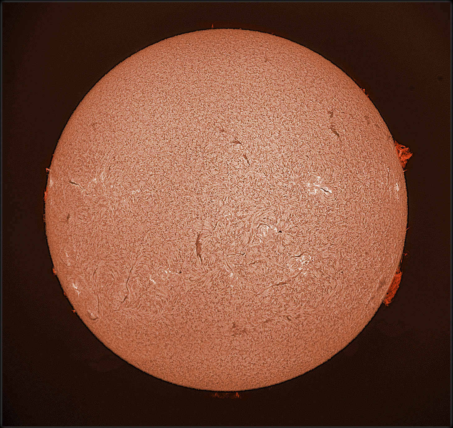 Am 4. Oktober 2014 war besonders viel auf der Sonne los. Dank dem LUNT 80 mm mit doppeltem Etalon gelingen Aufnahmen der Sonnenoberfläche mit den Protuberanzen, ohne zwei Teilbilder (Oberfläche und Protuberanzen) zusammenbasteln zu müssen.