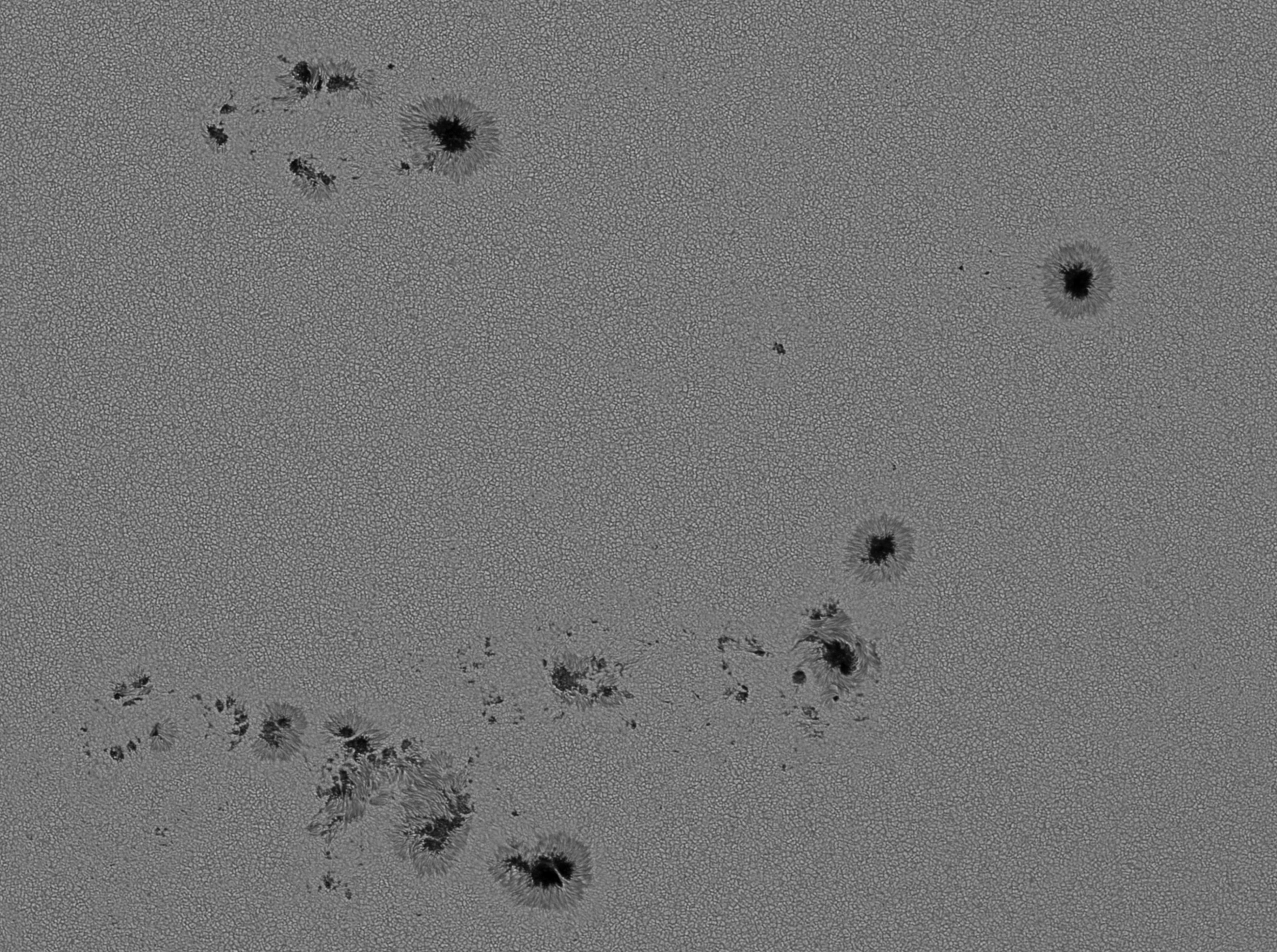 Am 29. Juli um 12:44 UT entstand das Foto der Fleckengruppen im Zentrum der Sonnenscheibe. Um diese Zeit ist das Seeing im Hochsommer meist nicht optimal. So auch beim vorliegenden Bild. Von 15000 Bildern wurde deshalb nur zehn Stück für die Weiterverarbeitung ausgewählt. Ein Herschelkeil mit 0,9 Graufilter und ein Kontinuumfilter mit 0,75 nm Durchlass wurde für die Lichtdämpfung verwendet. Die Aufnahme entstand auf der Sternwarte Schafmatt durch einem Starfire Refraktor 155 x 1150 mm. https://www.sternwarte-schafmatt.ch/