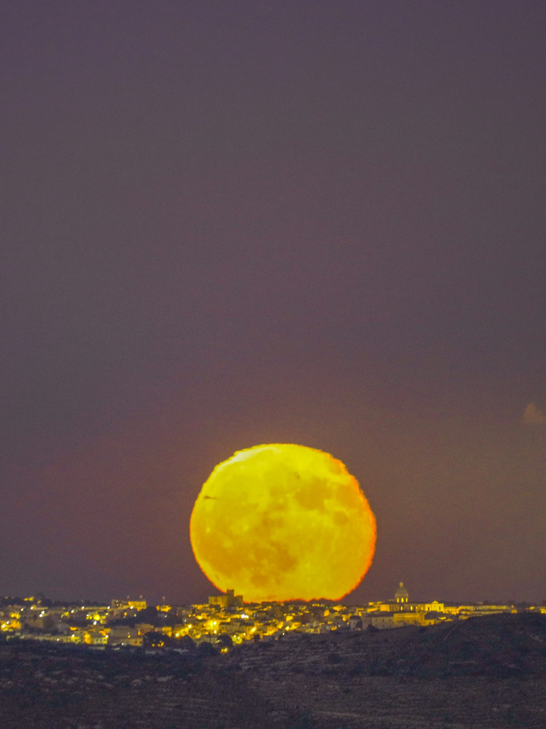 Aligned full moon rises over the ancient cityof Noto with its baroque sicilian cathedral