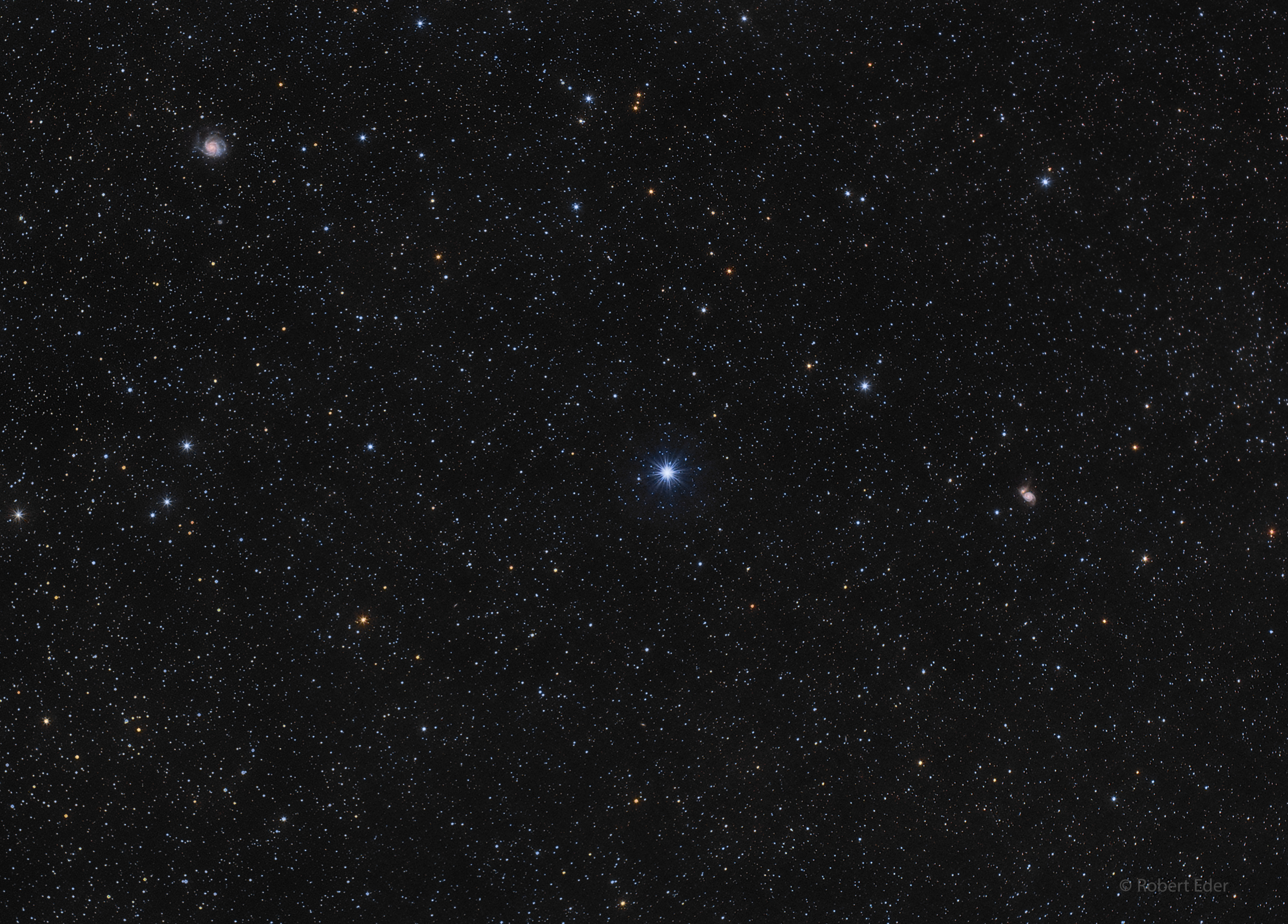 Der Stern Alkaid und beide Galaxien Messier 51 und 101 in einem Bild mit dem 85-mm-Objektiv. Ich war einfach neugierig, wie das aussieht. Natürlich sind sie winzig klein, aber irgendwie gefällt mir diese Übersichtsaufnahme. Jede Brennweite findet ihren Himmel.