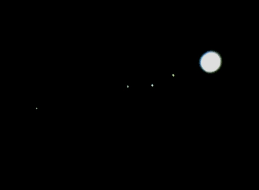 Am 30. August 2022 gegen 5:30 Uhr befanden sich alle vier Jupitermonde auf einer Seite des Planeten. Kurzer verwackelter Film davon: https://www.youtube.com/watch?v=00saw2Ke8B0