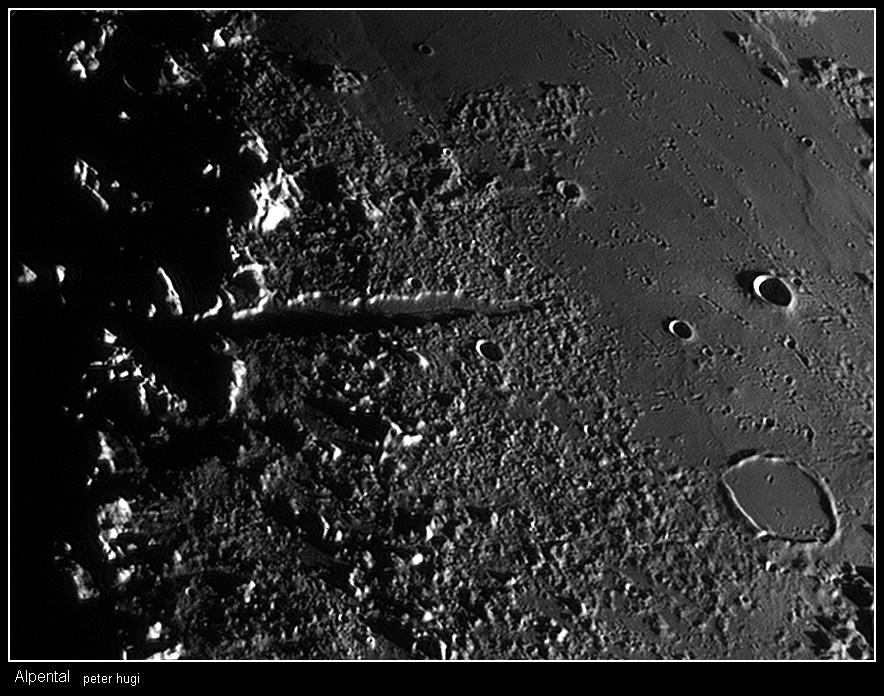 Beim Anblick des Alpentales auf dem Bildschirm konnte ich schon die Rille im Tal sehen. Leider ging die Sonne erst in diesem Bereich auf, sodass ein Teil des Tals noch im Schatten liegt.