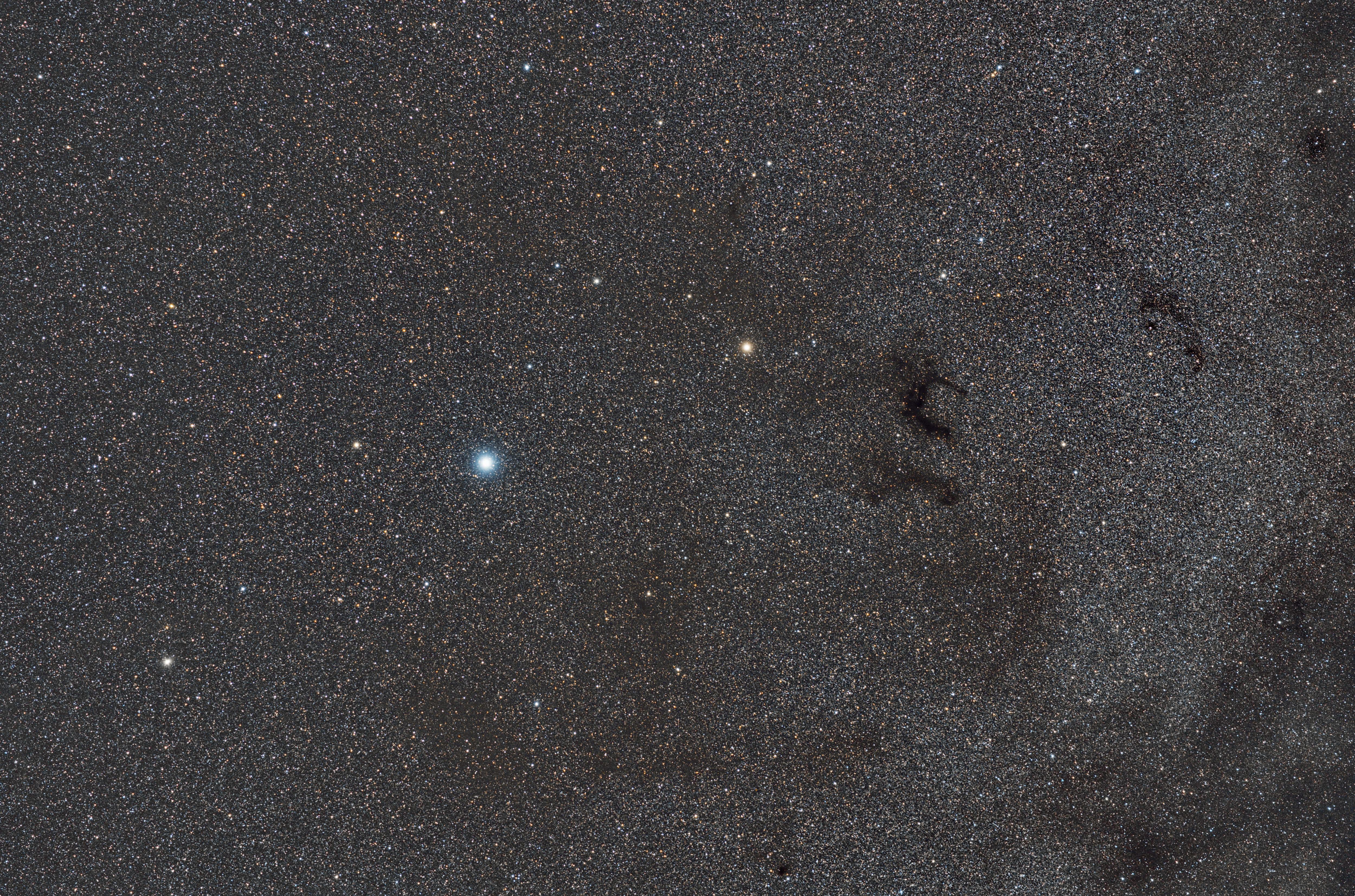 Bereits mit bloßem Auge bilden die beiden Sterne Altair (Alpha Aquilae) und Tarazed (Gamma Aquilae) im Sternbild Adler ein farblich markantes Paar am ländlichen Sternenhimmel. Der hübsche Farbkontrast wird dann besonders auf Fotografien deutlich. Altair (Spekralklasse A7V) leuchtet leicht bläulich während sich Tarazed (Spektralklasse K3II) orange-farben zeigt. In unmittelbarer Nachbarschaft sind auch die beiden Dunkelwolken Barnard 142 und 143 im Bild erkennbar. Diese formen, mit etwas Fantasie, Barnards E vor dem Sternenmeer unserer Milchstraße. (Für das Bild wurde mit manueller Rundblende vor dem Objektiv gearbeitet.)