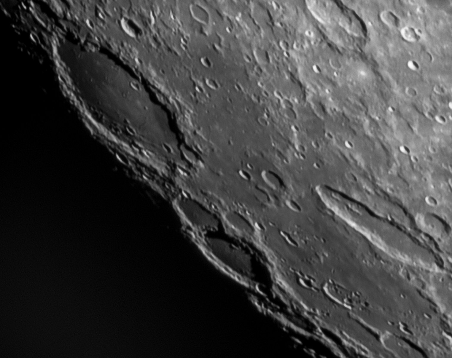 Oben links die über 200 Kilometer grosse Wallebene Schickard, während Wargentin noch im Schatten liegt. Die Krater Nasmyth und Phocylides gesellen sin etwas tiefer an. Rechts davon dann Schiller, diese große Wallebene, die tatsächlich eine eliptische Form hat. Es könnte sich um die Einschlagsstelle eines ehemaligen kleinen Trabanten unseres Mondes handeln, welcher in immer flacher werdender Umlaufbahn schlußendlich einschlug.