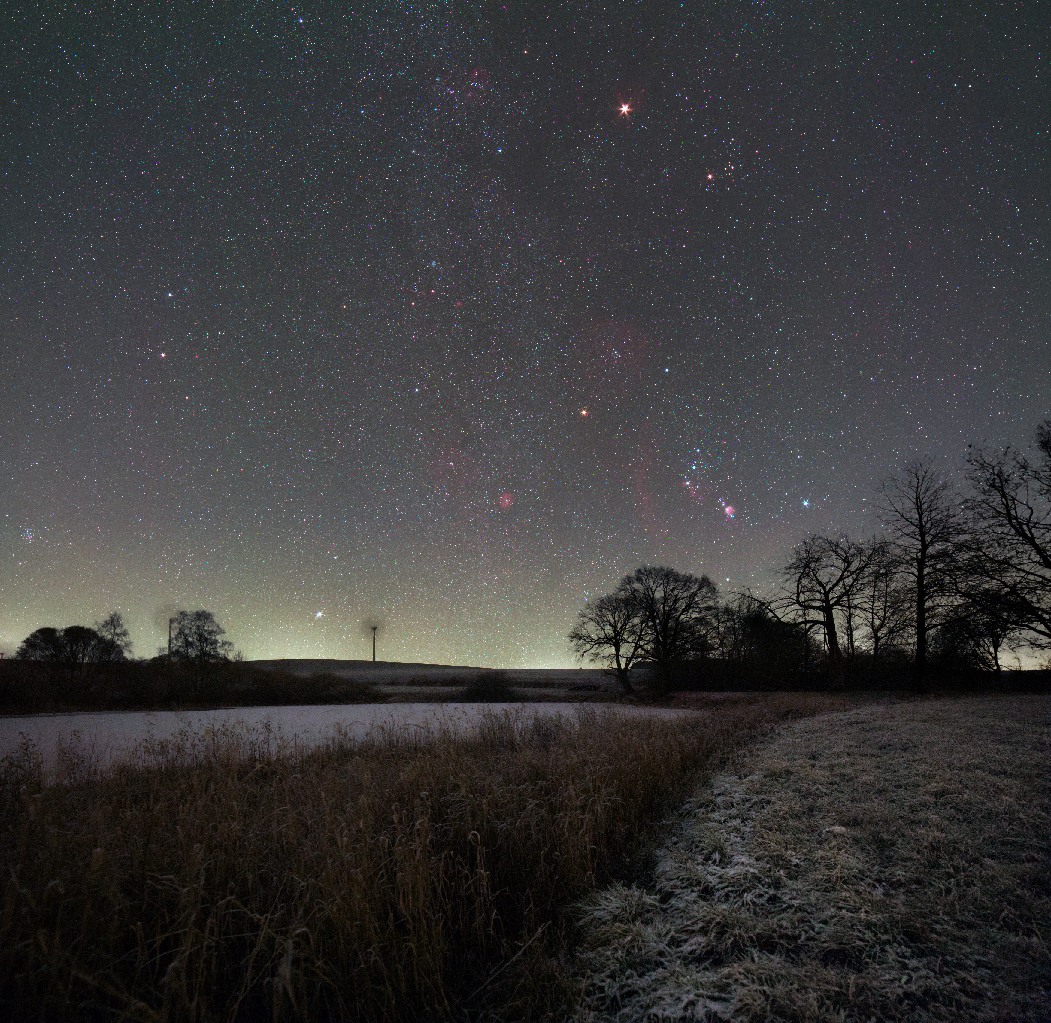 Die erste Dezemberwoche 2022 war in Rheinland-Pfalz geprägt von eisigen Temperaturen bis zu – 15 °C in der Nacht. Dies hatte zur Folge, dass sich auf kleineren Seen eine beachtliche Eisdecke ausbildete. Der zugefrorene Neuerweiher liegt ganz in der Nähe des Benratherhofes, einem ehemaligen Hofgut der Abtei Sankt Matthias in Trier aus dem 13. Jahrhundert im Naturpark Saar- Hunsrück.An diesem Abend im Dezember war das kleine Gewässer Ziel einer abendlichen Fotoserie. Über dem tiefgefrorenen Uferbereich mit hohem Gras und Schilf präsentiert sich ein beeindruckender Sternenhimmel mit einem Himmelsjäger Orion direkt über den mächtigen Eichen. Zu erkennen sind auch die Sternbilder Kleiner Hund und Zwillinge. Rötlich strahlt der Planet Mars nahe dem offenen Sternhaufen der Hyaden im Stier.