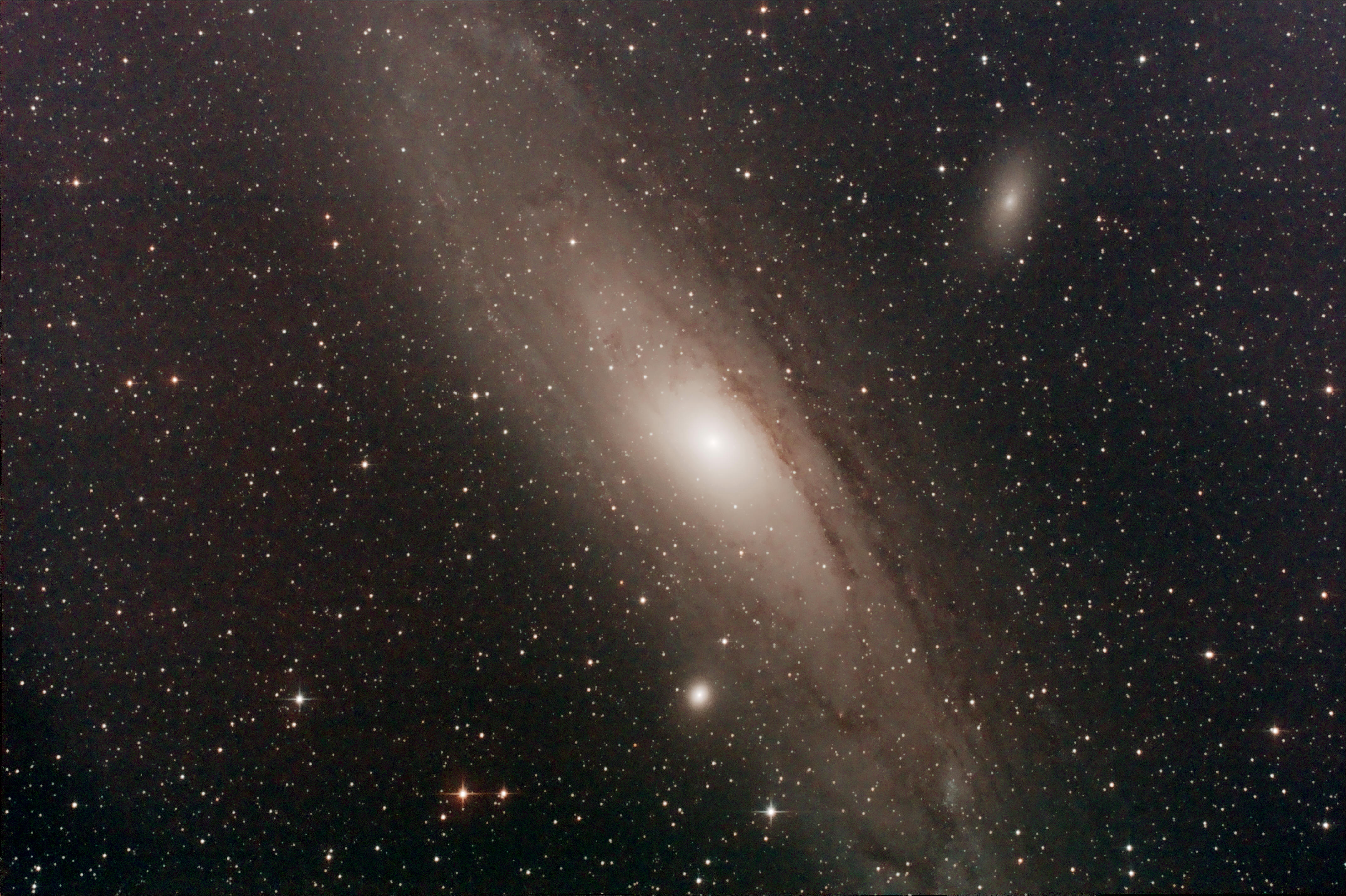 Als zweites Objekt des Abends am 10. Februar 2015 nahm ich noch die berühmte Andromedagalaxie Messier 31 auf. Die Anzahl der Bilder allenthalben im Netz ist zwar Legion, aber trotzdem reizte mich es an diesem Abend, sie auf´s Bild zu bannen, bevor ich mich zur Nachtruhe begeben musste, um am nächsten morgen wieder "fit for job" sein zu können, ein Zielkonflikt, den wohl fast jeder Astroamateur kennt.
