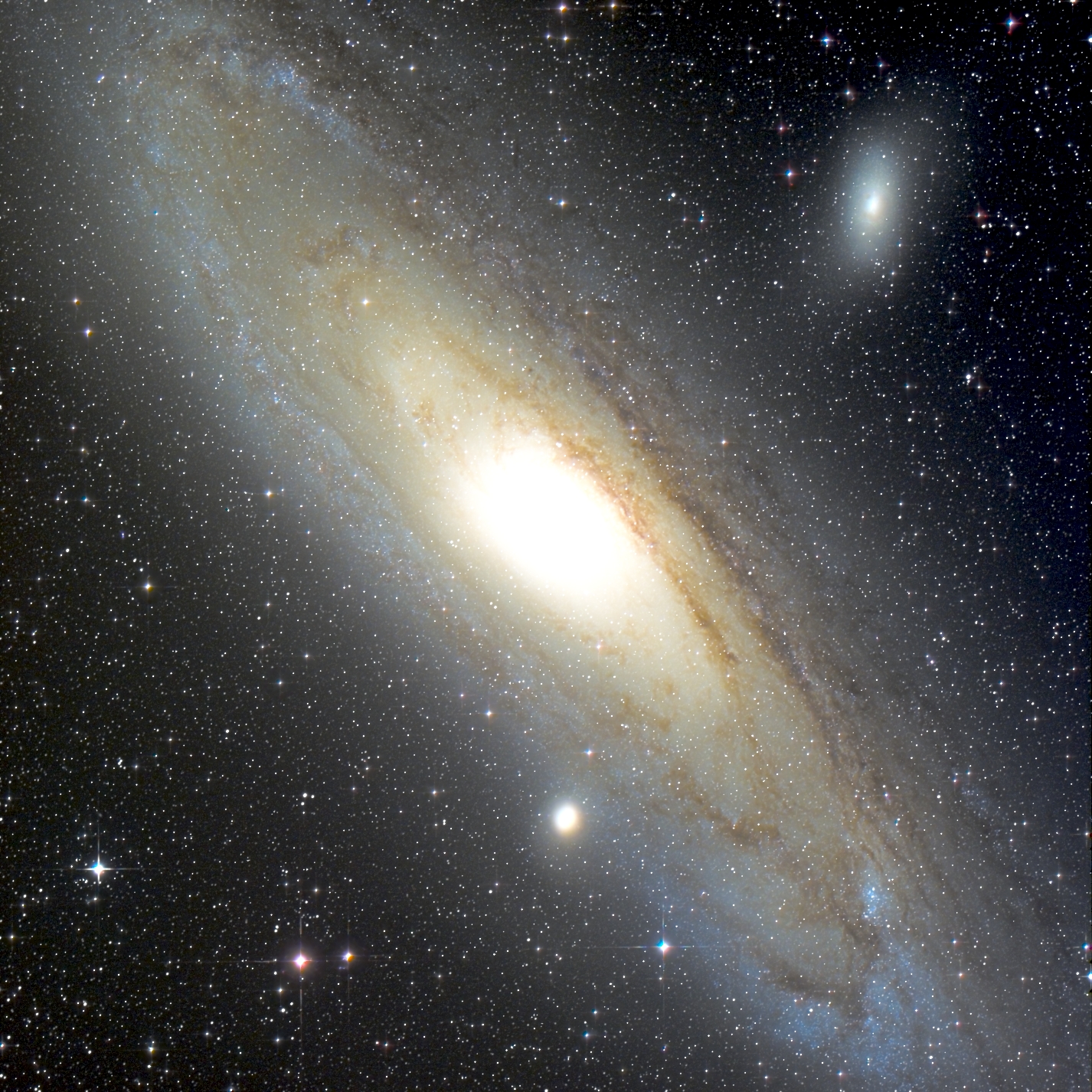 Nach einer Nachtwache vor einigen Tagen sah ich in halber Höhe in der zunehmenden Morgendämmerung den schwachen Lichtschein des Andromedanebels. Vor 50 Jahren bezeichnete man die nebeligen Wölkchen am Himmel noch als Spiralnebel! Es ist das einzige nichtstellare Deep-Sky-Objekt des Nordhimmels, das wir mit freiem Auge erkennen können. Alles andere sind nur Sterne! Die Saison für die Andromedagalaxie beginnt nun und viele Anfänger und Profis der Astrophotographie werden Optiken und Kameras aller Größen auf sie richten.Hier ist meine erste Aufnahme vom letzten Jahr als First Light meines Skywatcher Esprit 100 mm F4 und der neuen ZWOASI533MCPro Kamera in drei aufeinanderfolgenden Nächten mit insgesamt 10 Stunden Belichtungszeit. Endlich passt die gesamte Galaxie auf meinen Chip!! Bei starker Vergrößerung kann man auch den 18,6 mag hellen Hubbles variablen Nebel No. 1 erkennen (nächstes Bild), eine erstaunliche Leistung der kleinen Optik, die eigentlich nichts anderes ist als ein Teleobjektiv mit nur 10 cm Öffnung und 400 mm Brennweite!
