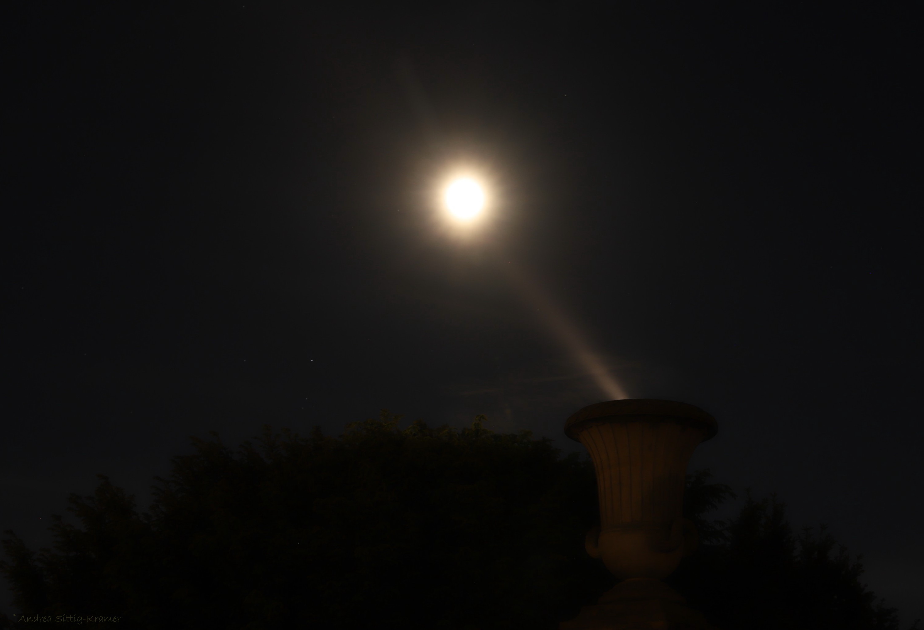 In der Nacht vom 18./19. Mai 2019 beherrschte der Vollmond den Nachthimmel. Am Neuen Rathaus in der niedersächsischen Landeshauptstadt Hannover begab ich mich auf die Suche nach Motiven mit dem voll erleuchteten Erdtrabanten. Der Strahler in der antik anmutenden Vase ist natürlich auf das Rathaus gerichtet. Durch geschickte Positionierung meiner Kamera, sah es aber so aus, als ob der Mond angestrahlt wird, bzw. der Mond das Licht in der Vase entzündet - wer weiß …