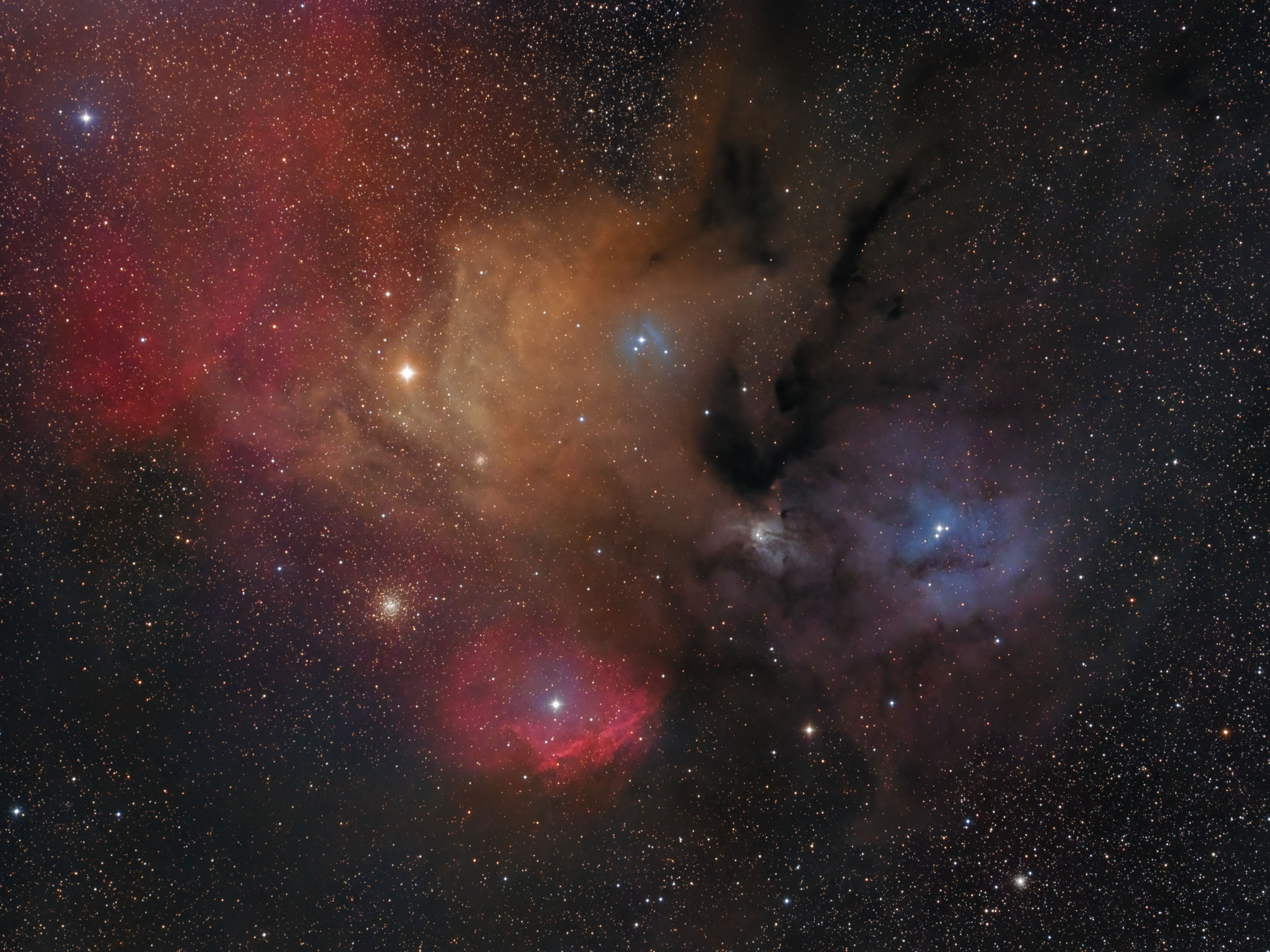 Die Antares-Region im Sternbild Skorpion zählt sicher zu den farbenprächtigsten Objekten am gesamten Himmel. Ich habe schon viele Bilder dieser Region gesehen, aber noch nie einen eigenen Versuch unternommen. In der Regel sind diese Aufnahmen in südlicheren Gefilden entstanden und aufgrund der extrem geringen Horizonthöhe hatte ich mir wenig Hoffnung auf Erfolg gemacht. Seit dem Umzug meiner Sternwarte im vergangenen Sommer habe ich zumindest theoretisch die Möglichkeit dazu, da mir bis dahin der Blick durch Bebauung versperrt war. In den Nächten vom 12.und 13. Juni 2023 hatte ich fleißig Photonen mit dem 135er-Samyang gesammelt und mich an die Bearbeitung der Daten gemacht. In den Rohstacks war nicht viel von der Pracht der Nebel zu erkennen, jedoch reichlich Gradienten durch künstliche Himmelsaufhellung. Ich denke, die größte Herausforderung bestand in der sauberen Beseitigung dieser, denn erst dadurch konnte ich dieser Region ihren Zauber entlocken. Ich habe mit LRGB-Filtern gearbeitet und zusätzliche Belichtungszeit in H-alpha investiert, um die roten Nebelbereiche noch etwas zu intensivieren. Die Farbe Rot sollte allerdings nicht zu dominant erscheinen und so habe ich die Beimischung entsprechend moderat dosiert.