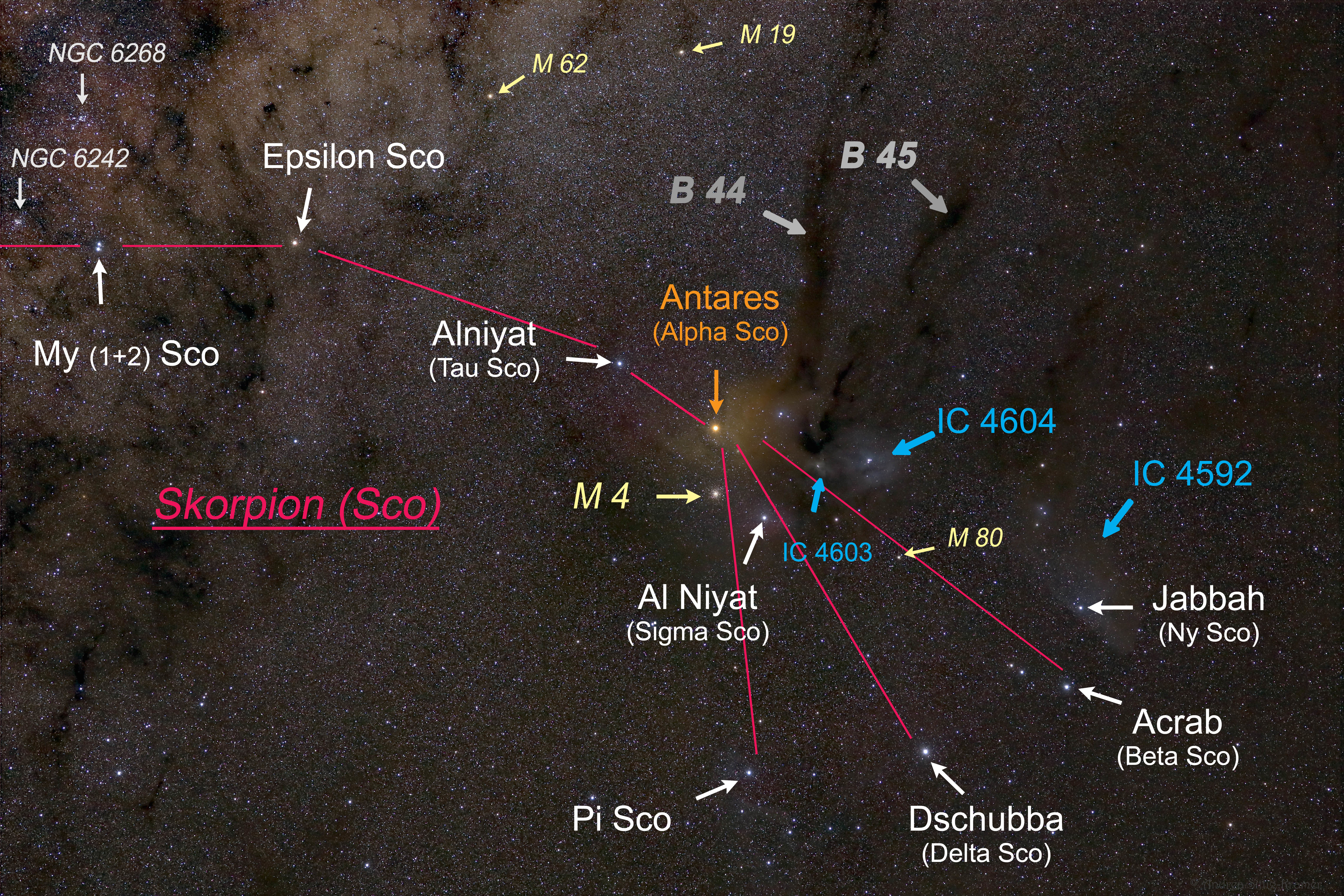 Die Region um den Stern Antares im Sternbild Skorpion gehört zu den farbenprächtigsten Arealen am Himmel. Sie befindet sich nahe des galaktischen Zentrums und enthält zahlreiche gelbliche und bläuliche Reflexionsnebel, rot leuchtenden Wasserstoff, schwarz-braune Dunkelwolken außerdem zahlreiche Deep Sky-Objekte, wie z.B. den Kugelsternhaufen M4 - auf meinem Bild direkt unterhalb des orange leuchtenden Antares.