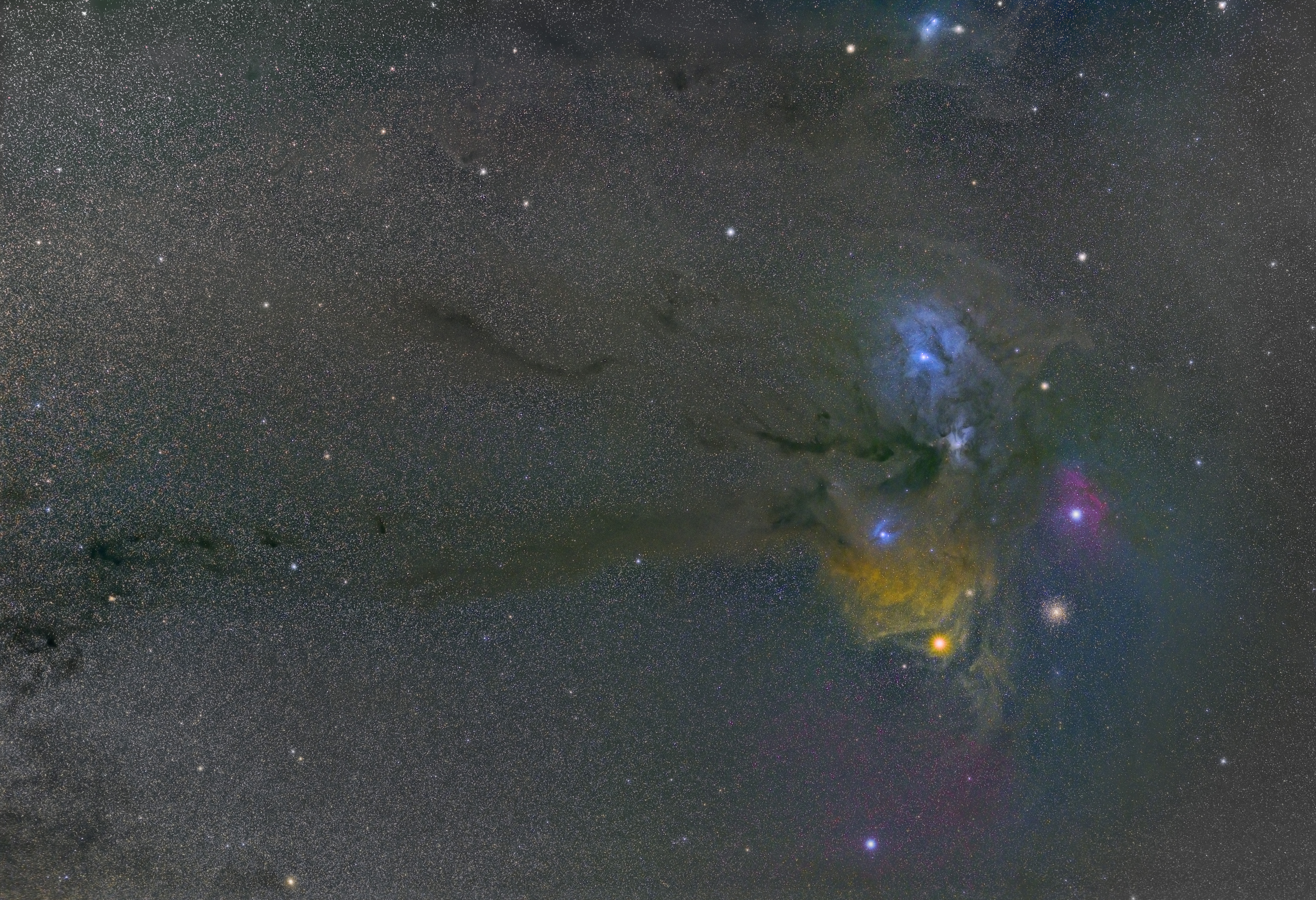 Diese farbenfrohe Aufnahme der Antares/Rho Ophiuchi-Region stammt aus dem Jahr 2017. Ich bemühe mich aktuell, die benachbarten Regionen abzulichten, um letztlich ein Mosaik des Sternbilds Skorpion zu erhalten. Aufgenommen mit der Nikon D750 und einer Sigma-Art-Festbrennweite 135 mm bei Blende 2,8 und ISO 800. Gesamtbelichtungszeit 200 Minuten.