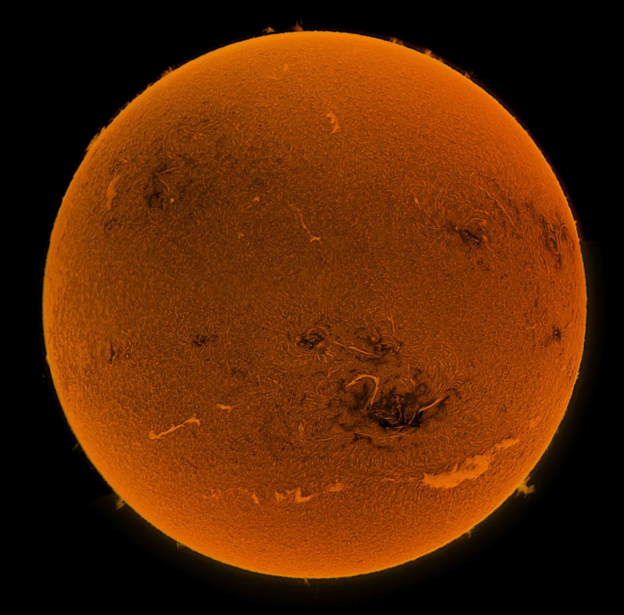 An diesem Morgen zeigen sich nur kleine Protuberanzen. Eindrucksvoll ist nebst den aktiven Zonen das lange Filament.