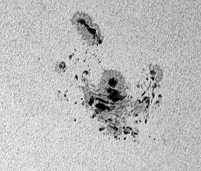 Dieser Fleck hat sich innerhalb eines Tages gewaltig entwickelt - und heute einen X-Flare 9.3 (!!) spendiert. Das ist seit Mai 2015 nicht mehr vorgekommen. Ich durfte es sogar mit meinem PST visuell beobachten (kleinste Wolkenlücken, nicht für ein Bild geeignet / right time - right place :-). Außerdem produzierte die Region bereits eine Typ II Radioemission mit der Geschwindigkeit von 1472 km/s (Info: solarham.com) und einen Massenauswurf, der uns heute zumindest teilweise treffen wird! Bei der Aufnahme zogen eine Menge Wolken durch das Gesichtsfeld, ich hatte ein mehr definiertes Bild erhofft. Da dieses Flareereignis aber außergewöhnlich ist, setze ich meine Aufnahme dann doch hier hinein. Man sieht schon, wie "wild" dieses Gebiet einen Tag vor dem Flare wirkt.