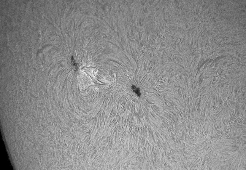 Auch im H-Alpha-Bild sieht man die Struktur der Lichtbrücken in den Sonnenflecken.