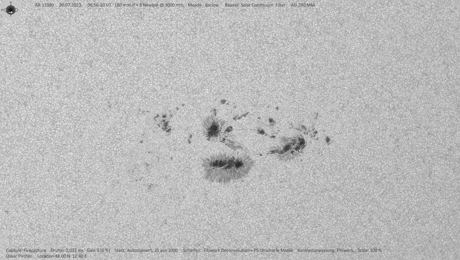 Ein heftiger Westwind hatte heute am frühen Vormittag die Wolken vertrieben. Manche Böe zerrte heftig am Teleskop, doch insgesamt herrschte ausgezeichnetes Seeing. Die aktive Region 13380 weist gegenüber der Aufnahme von vor zwei Tagen seit der letzten Aufnahme kräftigere Flecken auf.
