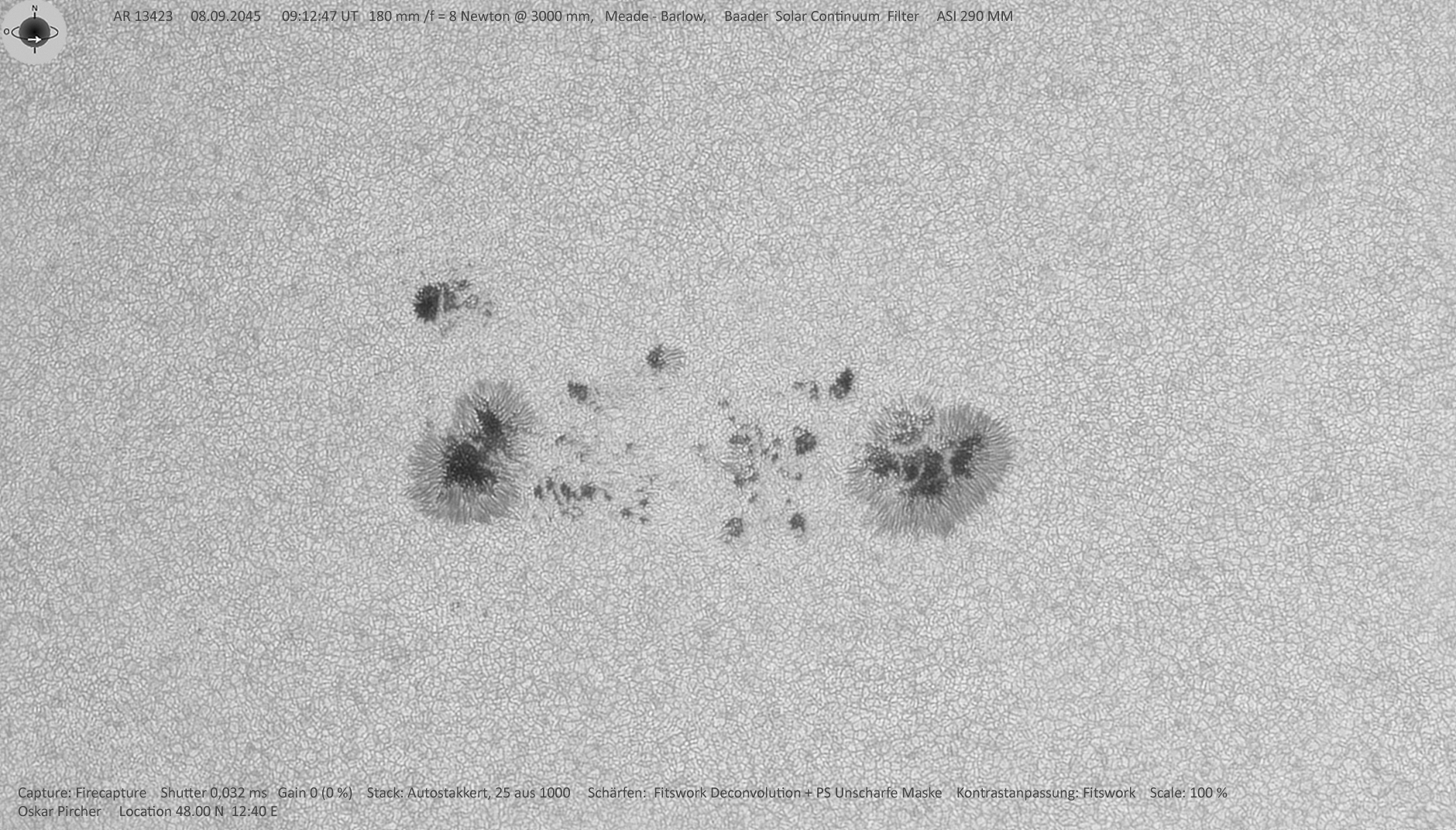 Die Fleckengruppe der aktiven Region 13423 war für mich heute das attraktivste Objekt auf der Sonnenoberfläche. Es brauchte etwas Ausdauer, bis das Seeing gegen Mittag besser wurde.