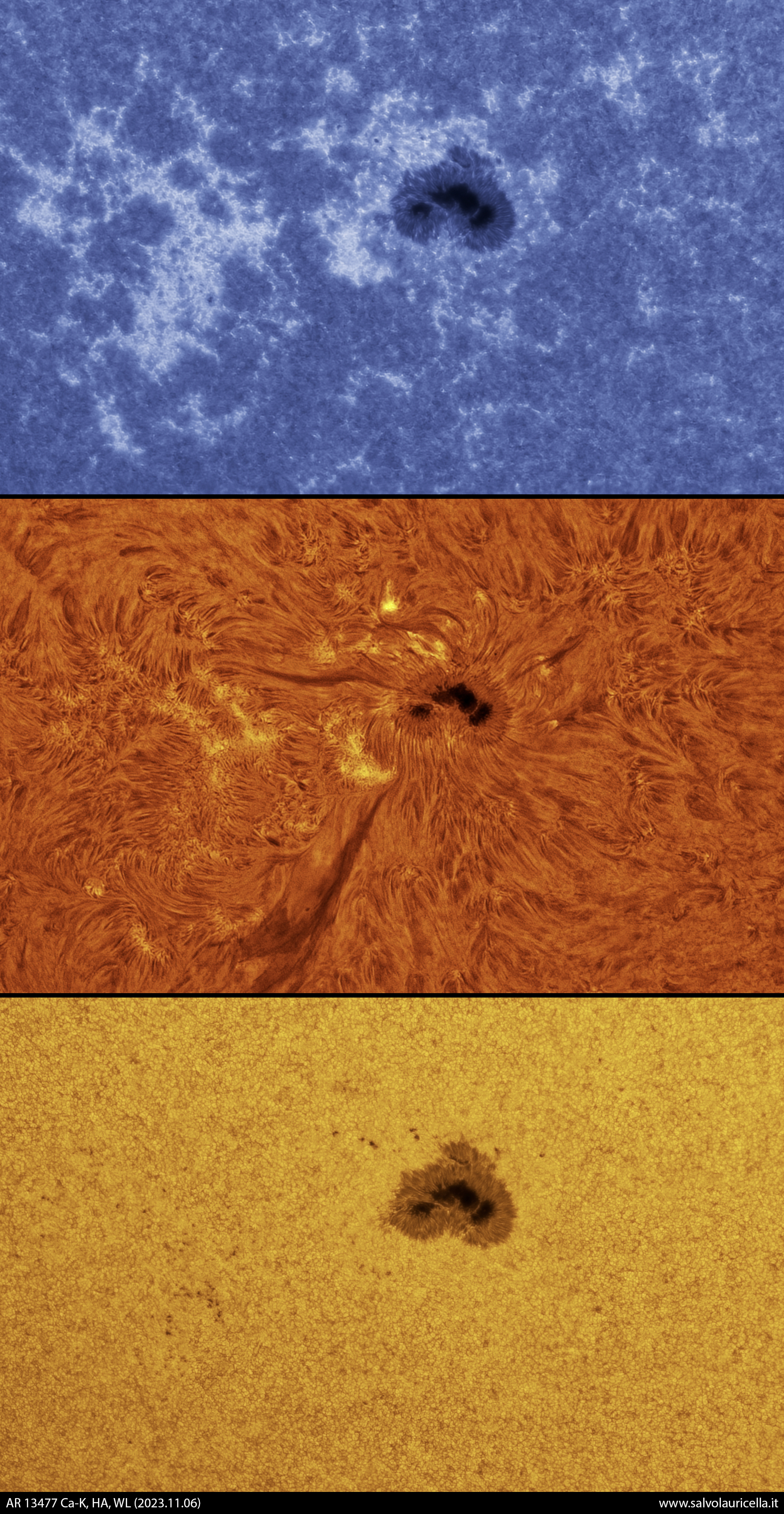 Active region 13477 imaged in white light, Ca-K and H-Alpha. Setup: iOptron CEM70G, Tecnosky APO SLD 130/910, ZWO ASI174MM. White Light: Lunt 2” Herschel wedge, Baader Solar Continuum, Baader UV/IR Cut, Tele Vue Powermate 5x;