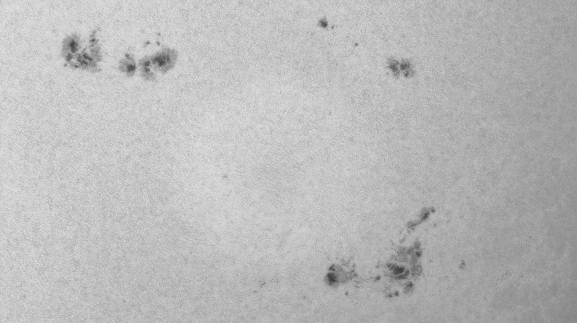 Ein nahezu rechtwinkliges Dreieck bildeten gestern die aktiven Regionen 13697 (rechts unten), 13701 (rechts oben) und 13703 im südwestlichen Quadranten der Sonne. Ich habe die effektive Brennweite reduziert, um alle drei Fleckengruppen gerade noch so auf das Bild zu bekommen.