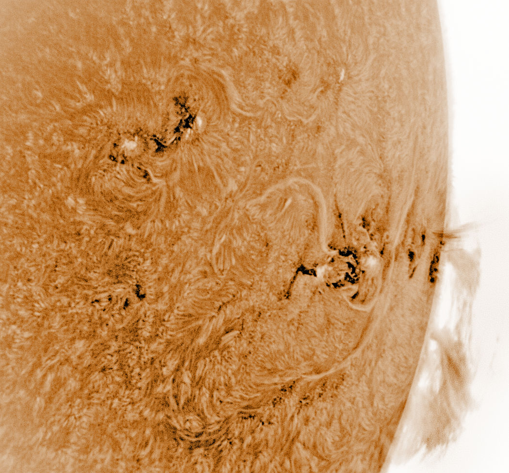 Um 01:49 UTC heute Nacht produzierte der gezeigte Sonnenfleck einen Energieausbruch der Stärke M 9.7 mit einem großen Massenauswurf. (Also fast ein X-Flare.) Außer dass der Wind meinen Refraktor manchmal ordentlich durchschüttelte, hatte ich gute Bedingungen, um den Fleck und die "Reste" des Filaments - der Protuberanz -aufzunehmen. Des m. E. angenehmeren Sehens wegen, habe ich das Bild etwas eingefärbt.